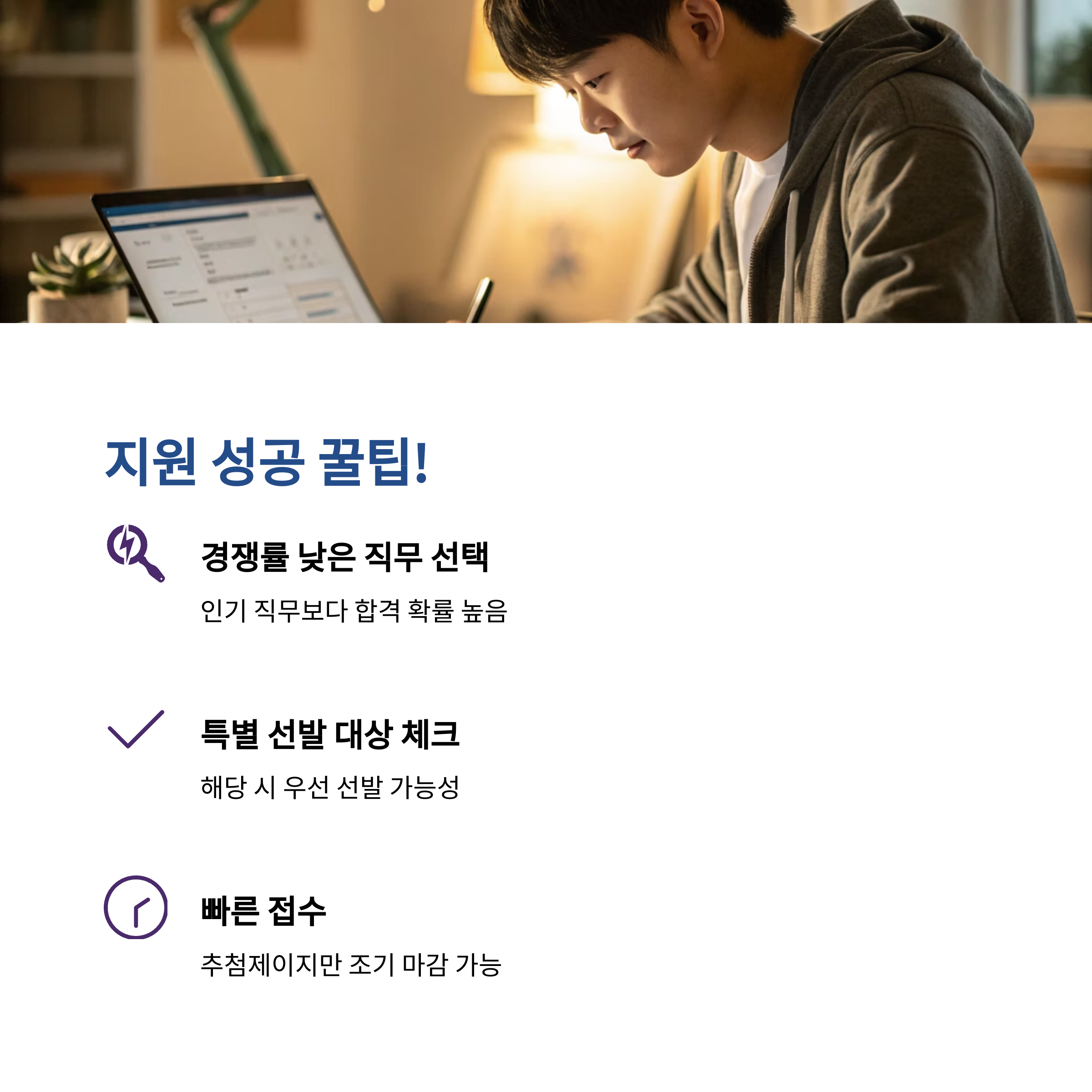 - 직무 선택은 신중하게!: 경쟁률이 낮은 직무를 노려보세요.