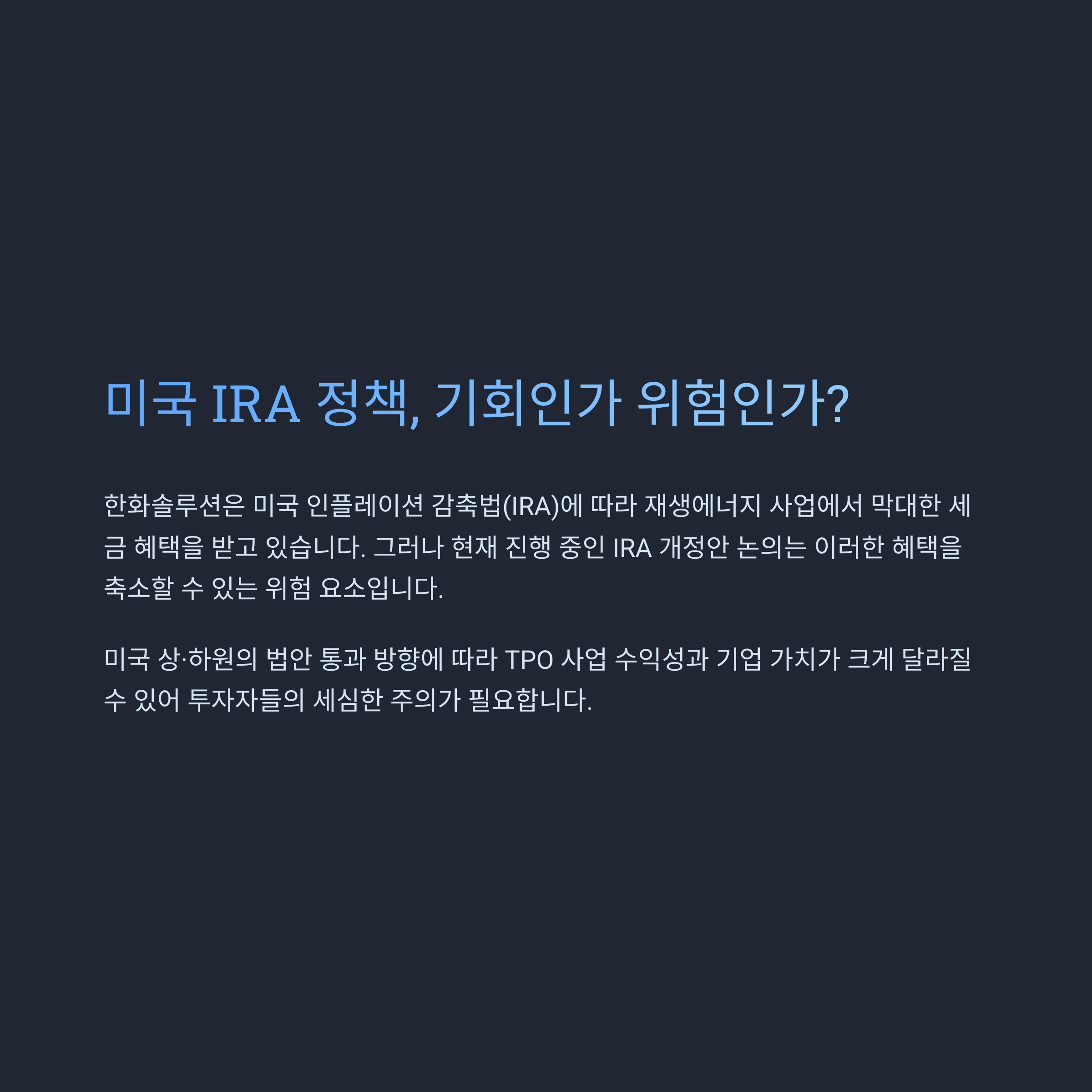 한화솔루션의 미국 내 재생에너지 사업은 IRA(인플레이션 감축법)에 따라 막대한 세금 혜택을 받고 있습니다. 그러나 현재 진행 중인 IRA 개정안 논의는 이러한 혜택을 줄일 수 있는 위험 요소로 작용하고 있습니다.