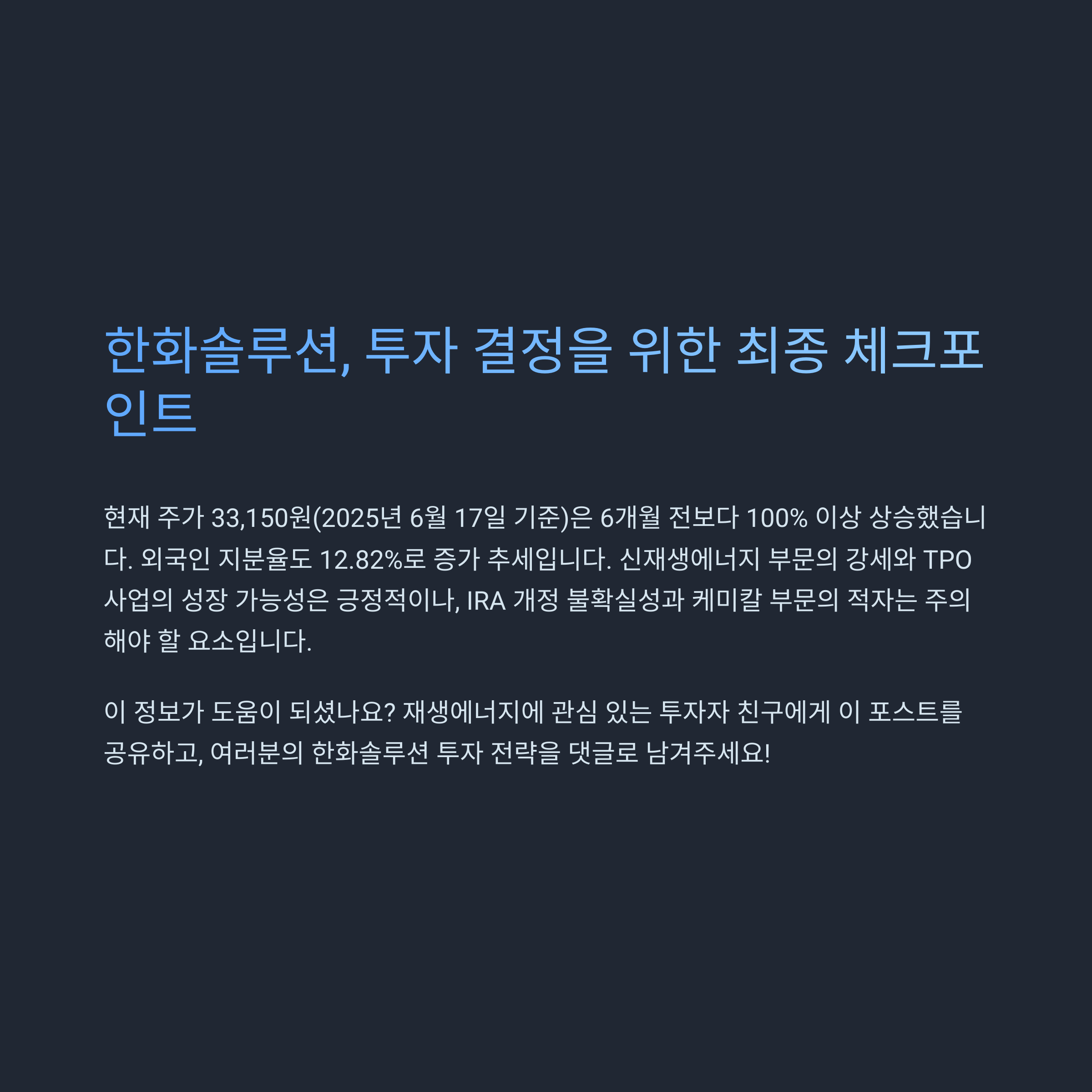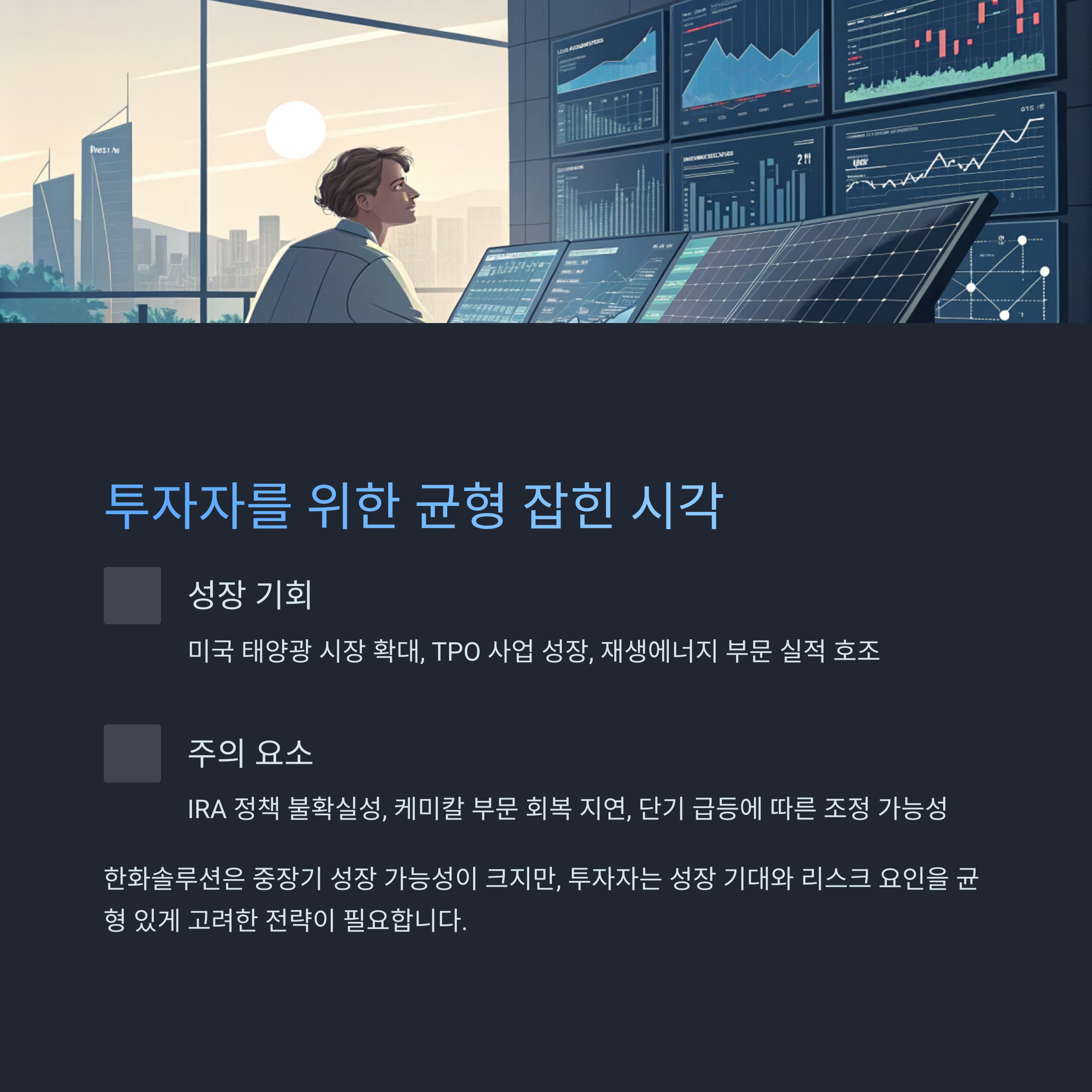 한화솔루션은 분명히 중장기 성장 가능성이 크지만, 투자자 입장에서는 IRA 정책 불확실성과 케미칼 부문 회복 지연 등의 리스크도 고려해야 합니다.