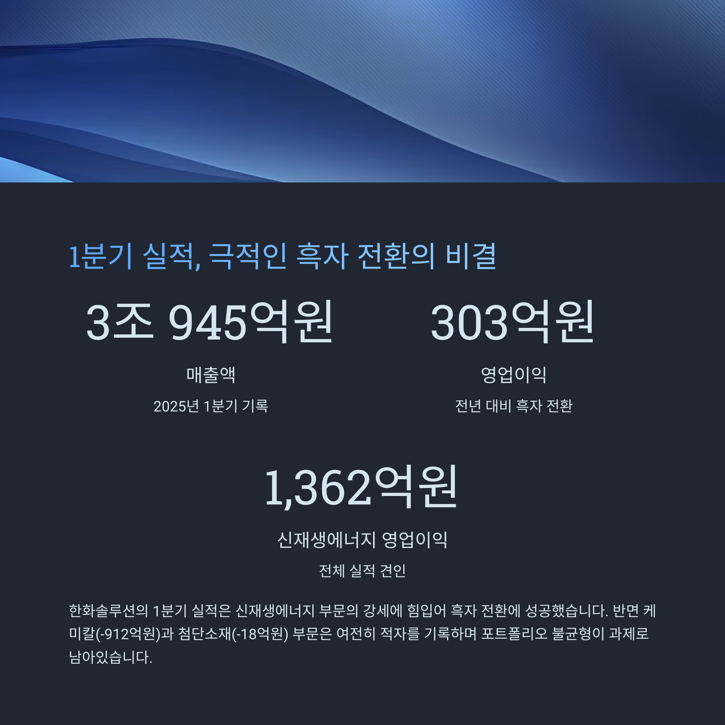 한화솔루션은 2025년 1분기에 매출 3조 945억 원, 영업이익 303억 원을 기록하며 전년 동기 대비 흑자 전환에 성공했습니다. 이 중 신재생에너지 부문이 핵심 역할을 했는데, 해당 부문은 매출 1조 5,992억 원, 영업이익 1,362억 원을 달성했습니다.