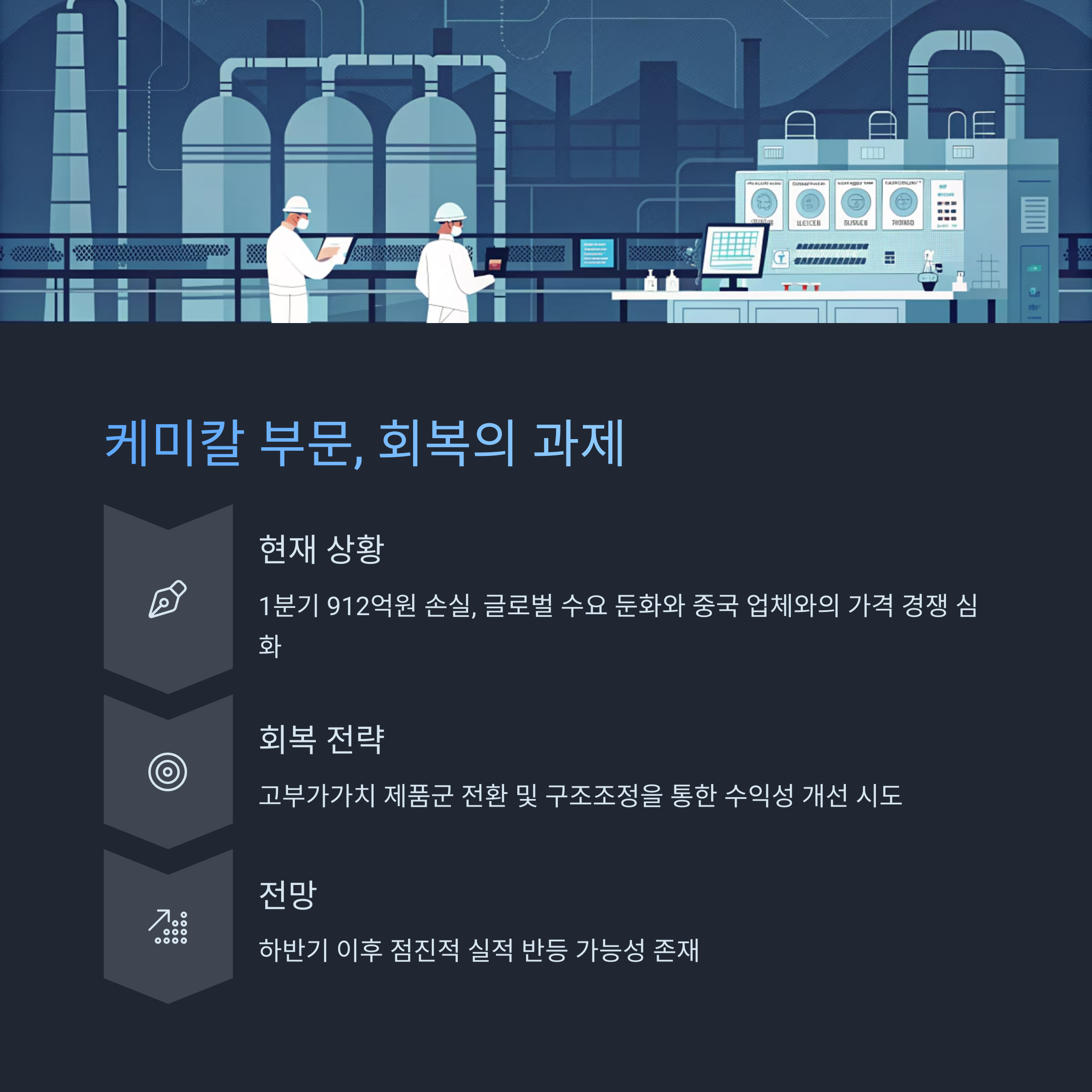 2025년 1분기에도 케미칼 부문은 912억 원의 손실을 기록했습니다. 글로벌 수요 둔화와 경쟁 심화, 특히 중국 업체들과의 가격 경쟁이 부담으로 작용하고 있습니다.