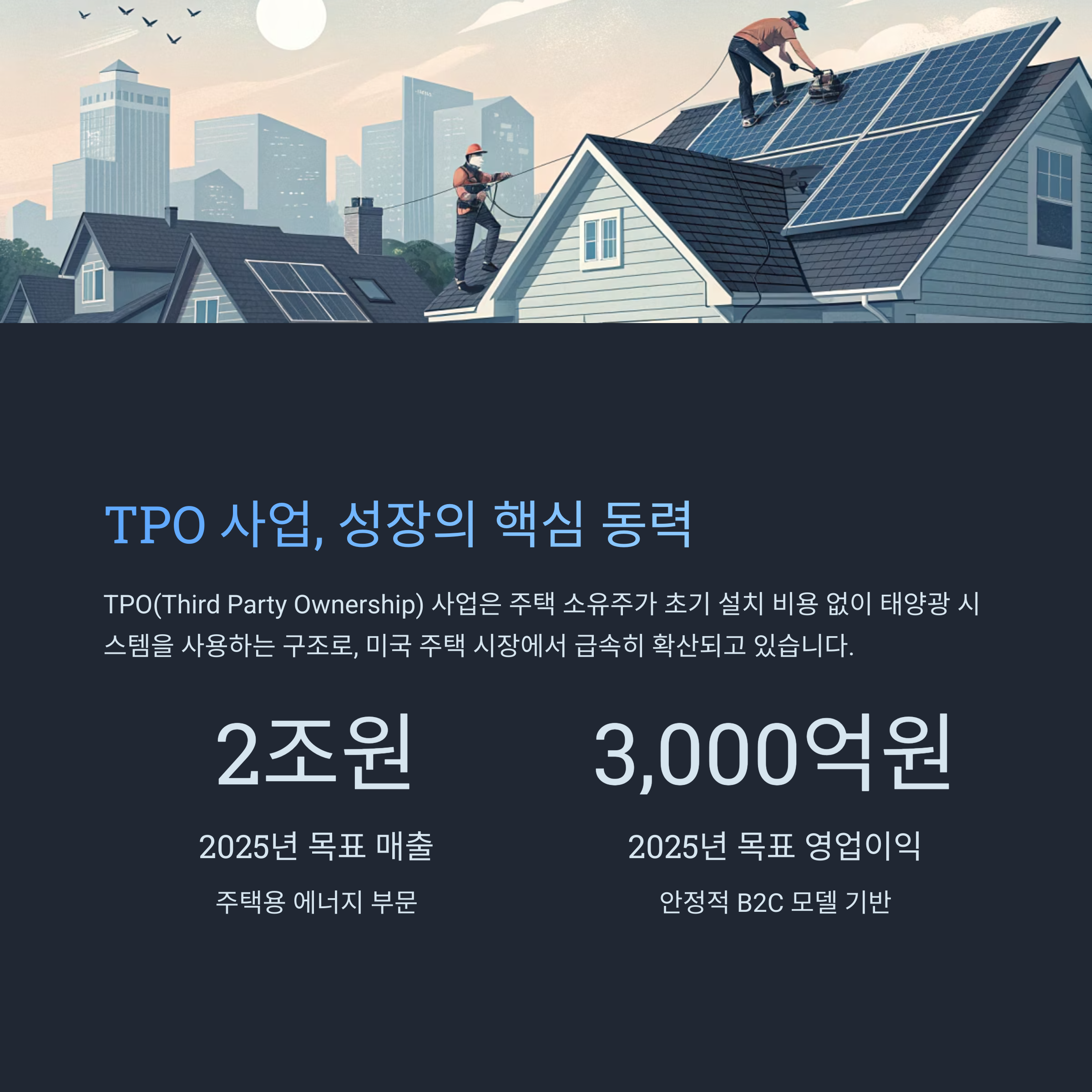 TPO(Third Party Ownership) 사업은 주택 소유주가 초기 설치 비용 없이 태양광 시스템을 사용하는 구조로, 미국 주택 시장에서 빠르게 확산 중입니다. 한화솔루션은 이를 바탕으로 2025년 한 해에만 주택용 에너지 매출 2조 원, 영업이익 3,000억 원을 목표로 하고 있습니다.