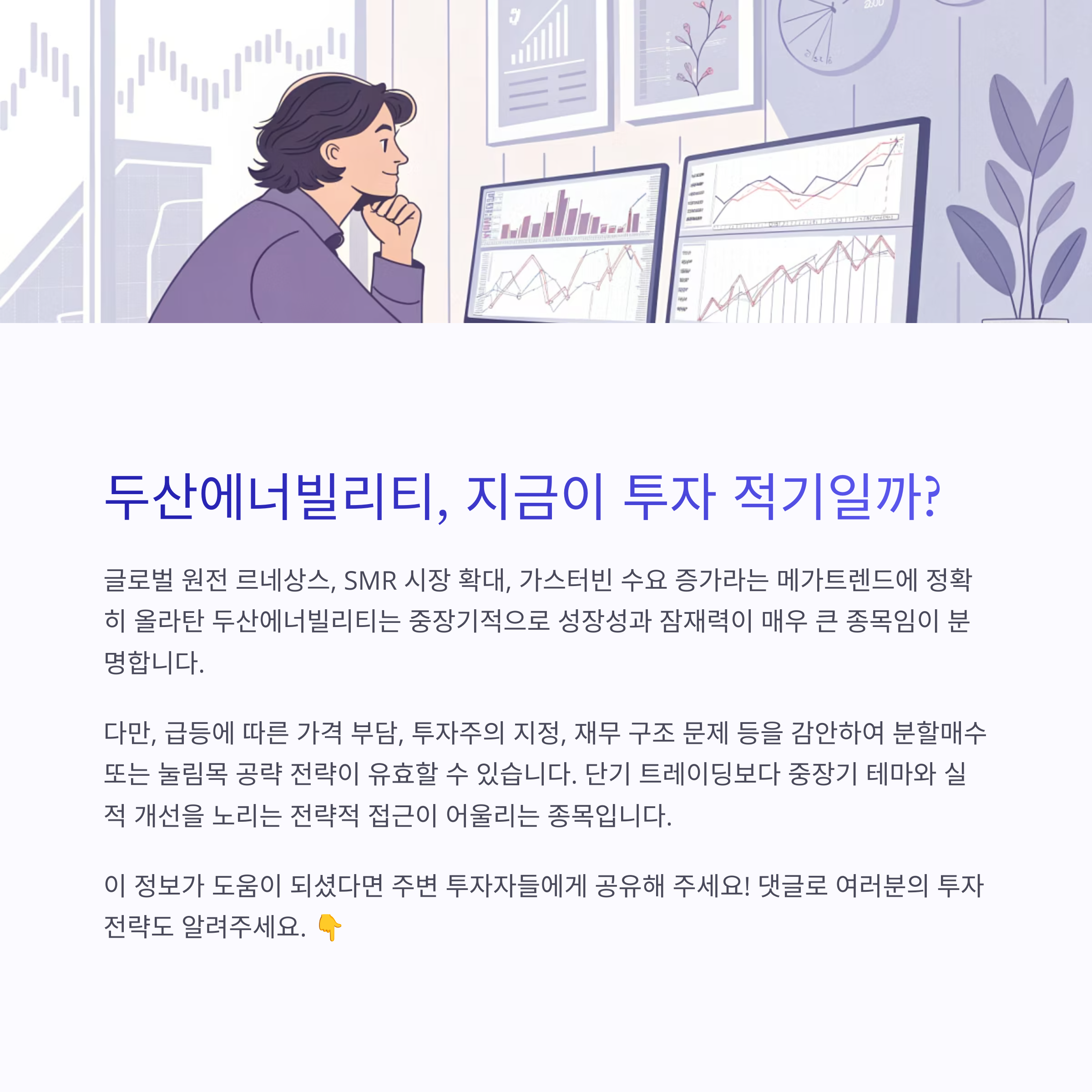 두산에너빌리티는 단기 트레이딩보다 중장기 테마와 실적 개선을 노리는 전략적 접근이 어울리는 종목입니다.