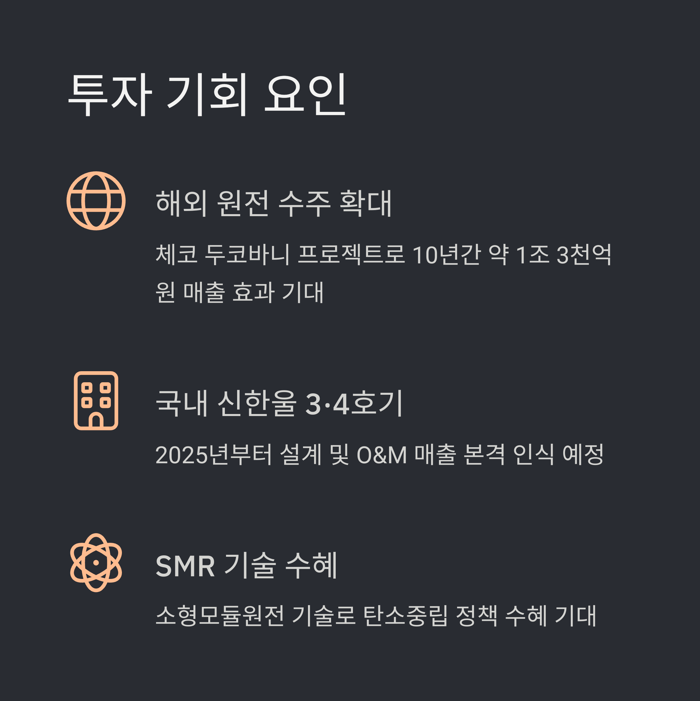 체코 두코바니 5·6호기 프로젝트는 향후 10년간 약 1조 3,000억 원의 매출 효과가 기대되는 대형 계약입니다. 2023~2025년 동안 연평균 매출에 본격적으로 기여할 것으로 보이며, 향후 아랍에미리트(UAE), 네덜란드 등 다른 국가와의 협력도 긍정적인 흐름을 보이고 있습니다. 이처럼 글로벌 원전 수주 확대는 한전기술 주가 상승의 가장 강력한 모멘텀 중 하나입니다.