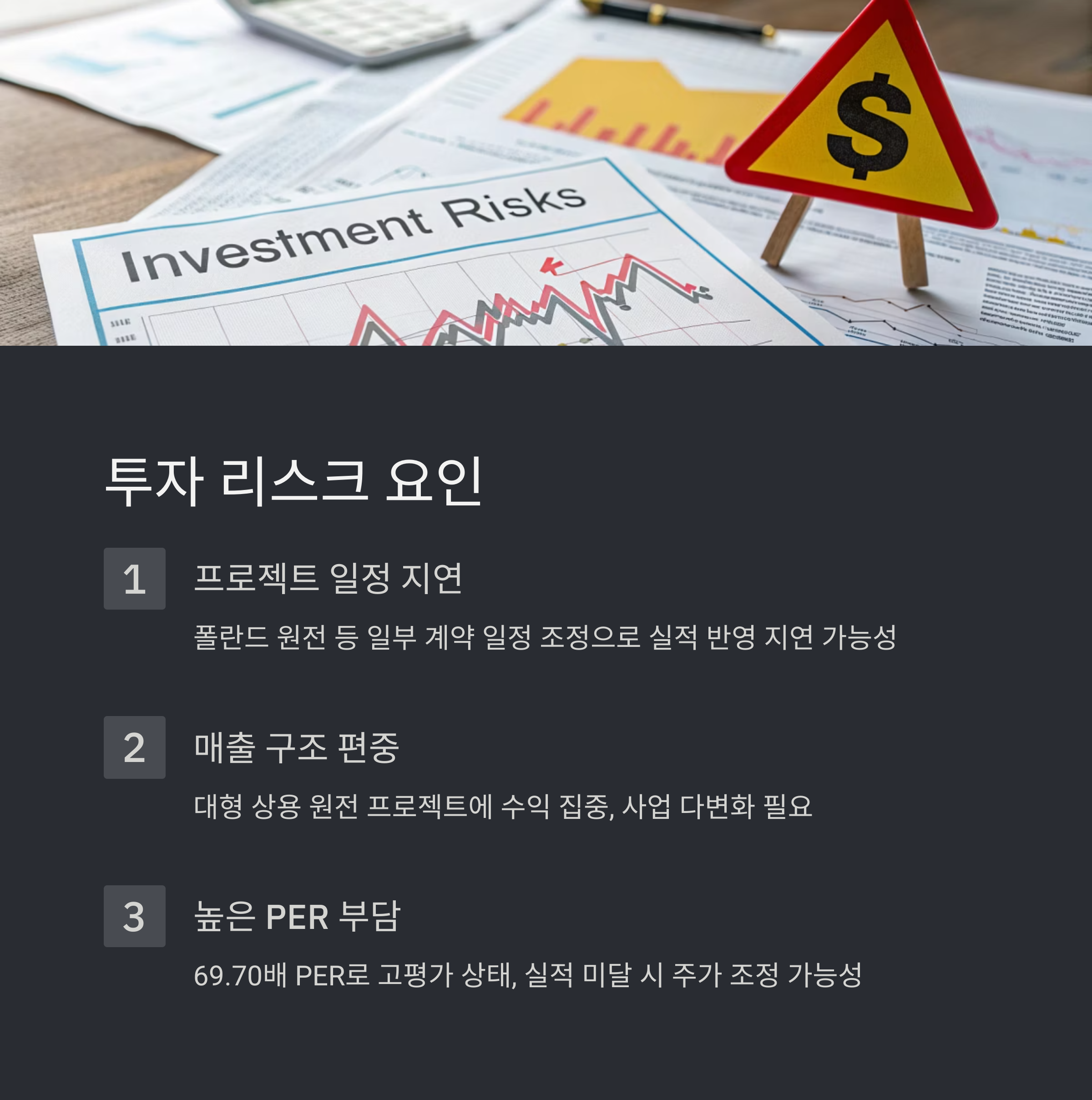폴란드 원전 프로젝트 등 일부 계약이 점검 혹은 일정 조정 중이라는 소식이 전해지며, 실적 반영 시점이 늦춰질 수 있는 가능성도 배제할 수 없습니다. 원전 프로젝트 특성상 정치적 요인 및 규제 변수가 실적에 영향을 미칠 수 있다는 점을 유념해야 합니다.