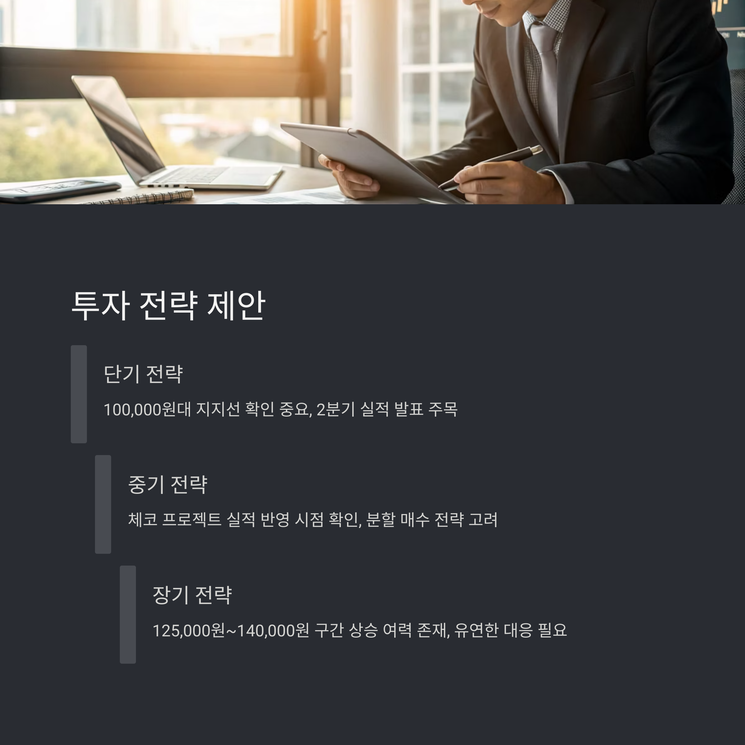 단기적으로는 100,000원대의 지지선 확인이 중요하며, 향후 2분기 실적 발표와 체코 프로젝트의 실적 반영 시점이 한전기술 주가의 방향성을 결정지을 수 있습니다. 중장기적으로는 125,000원~140,000원 구간까지의 상승 여력이 충분히 존재하므로, 분할 매수와 분할 매도를 병행한 유연한 대응이 필요한 시점입니다.