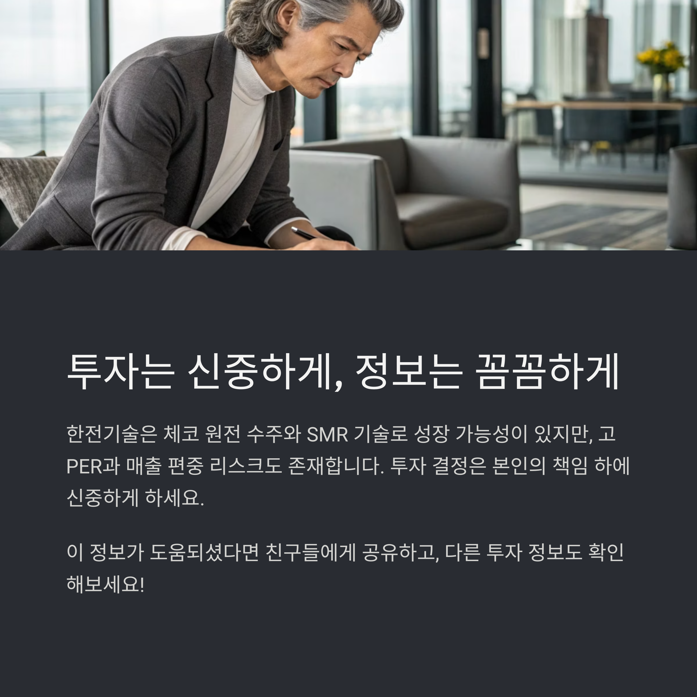한전기술은 체코를 비롯한 해외 원전 수주 확대, 국내 신한울 프로젝트 매출 본격화, SMR 기반 장기 성장 기대 등 긍정적 요소가 많은 종목입니다. 하지만 동시에 일정 지연, PER 고평가, 매출 편중 등 구조적인 리스크도 존재합니다.