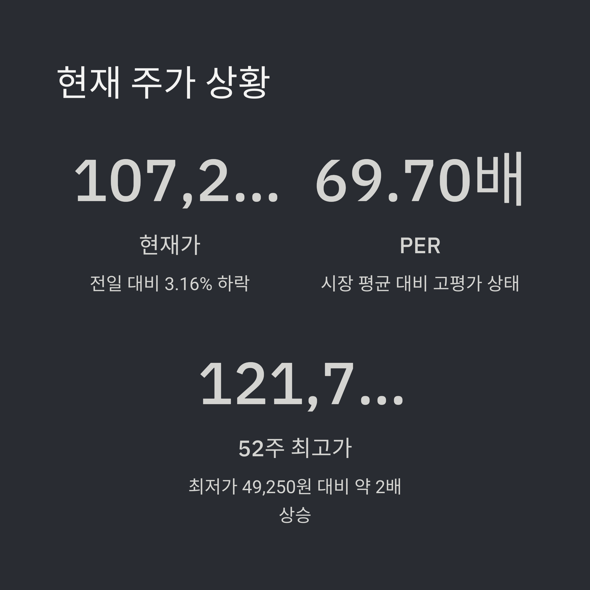 현재 PER이 69.70배에 달하는 것은 명백히 고평가 구간입니다. 이는 향후 실적이 기대에 미치지 못할 경우 주가가 크게 조정될 수 있음을 의미합니다. 따라서 신규 진입 시 분할 매수 전략이 보다 안전한 선택일 수 있습니다.