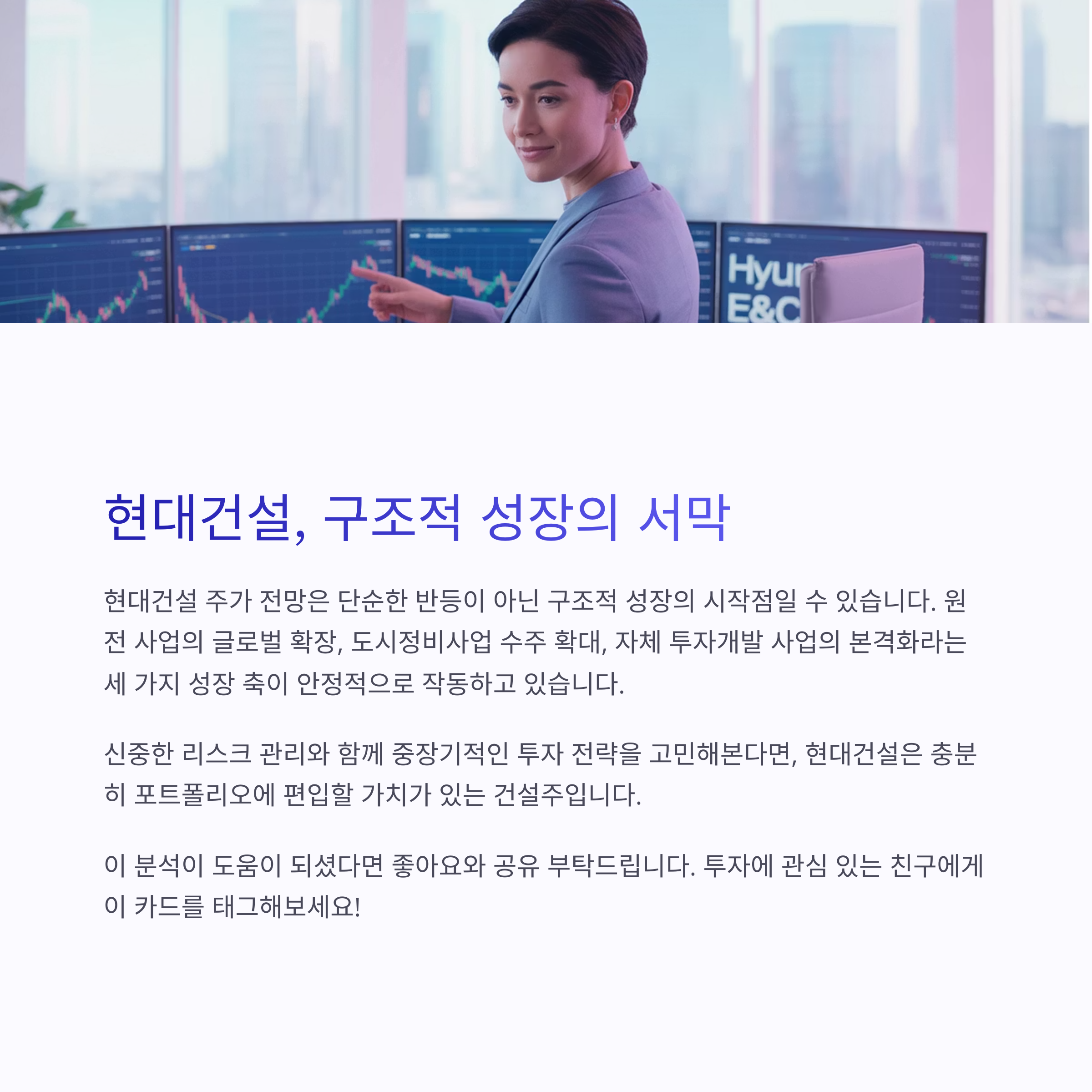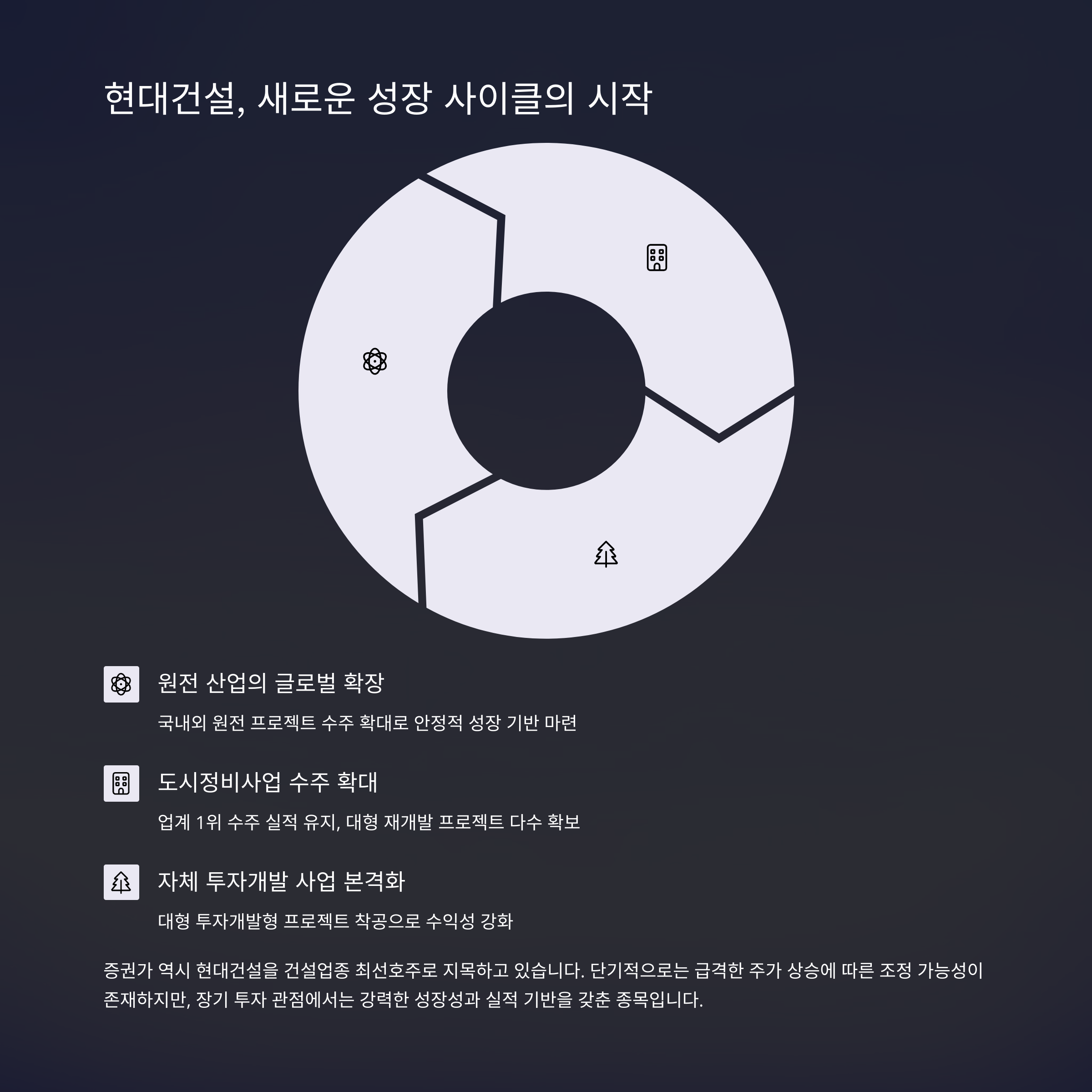 이 세 가지 축이 안정적으로 작동하고 있으며, 증권가 역시 현대건설을 건설업종 최선호주로 지목하고 있습니다.