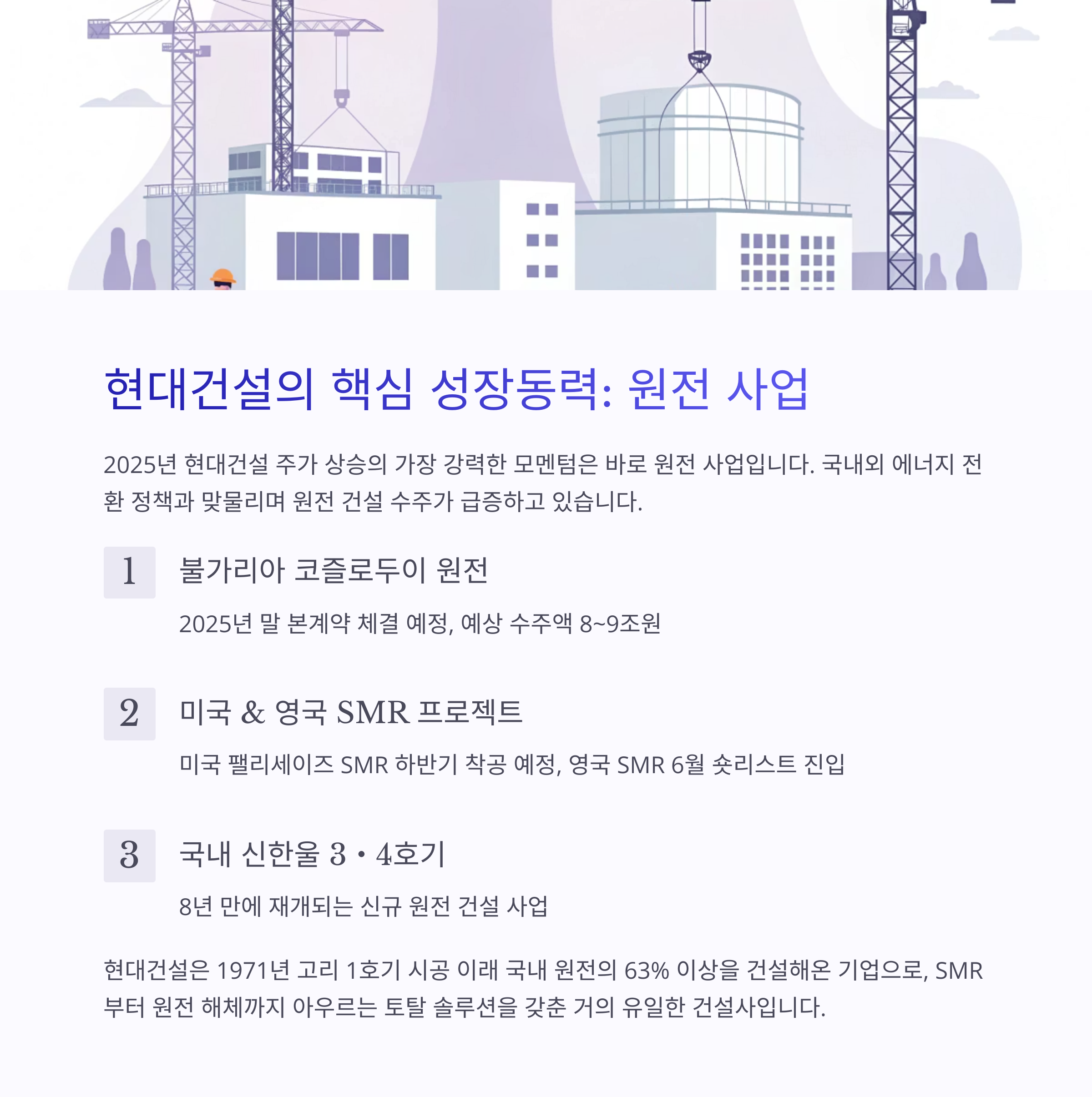 현대건설은 1971년 고리 1호기 시공 이래 국내 원전의 63% 이상을 건설해온 기업으로, SMR부터 원전 해체까지 아우르는 토탈 솔루션을 갖춘 거의 유일한 건설사입니다.