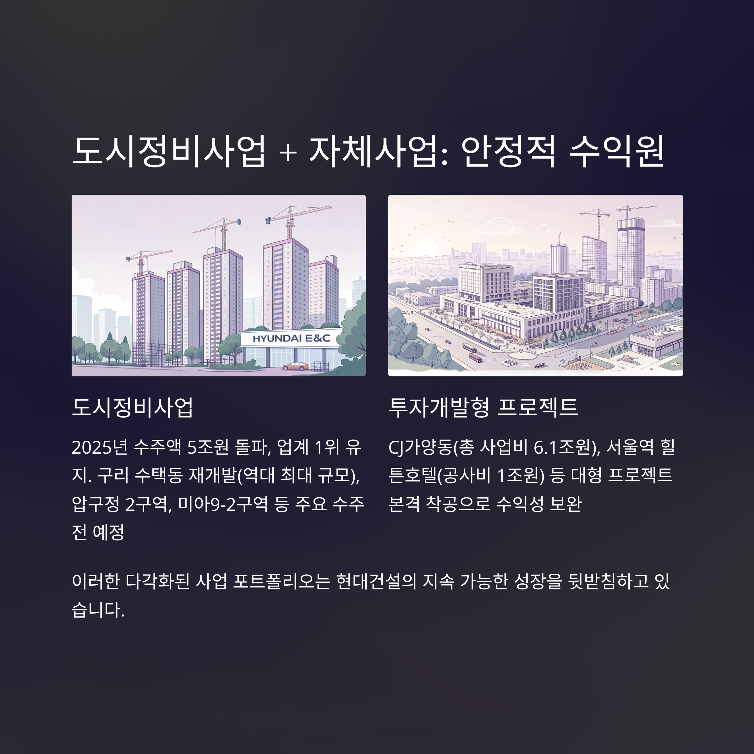 2025년 현대건설은 단순한 실적 회복이 아닌, 새로운 성장 사이클에 진입한 것으로 평가됩니다.
