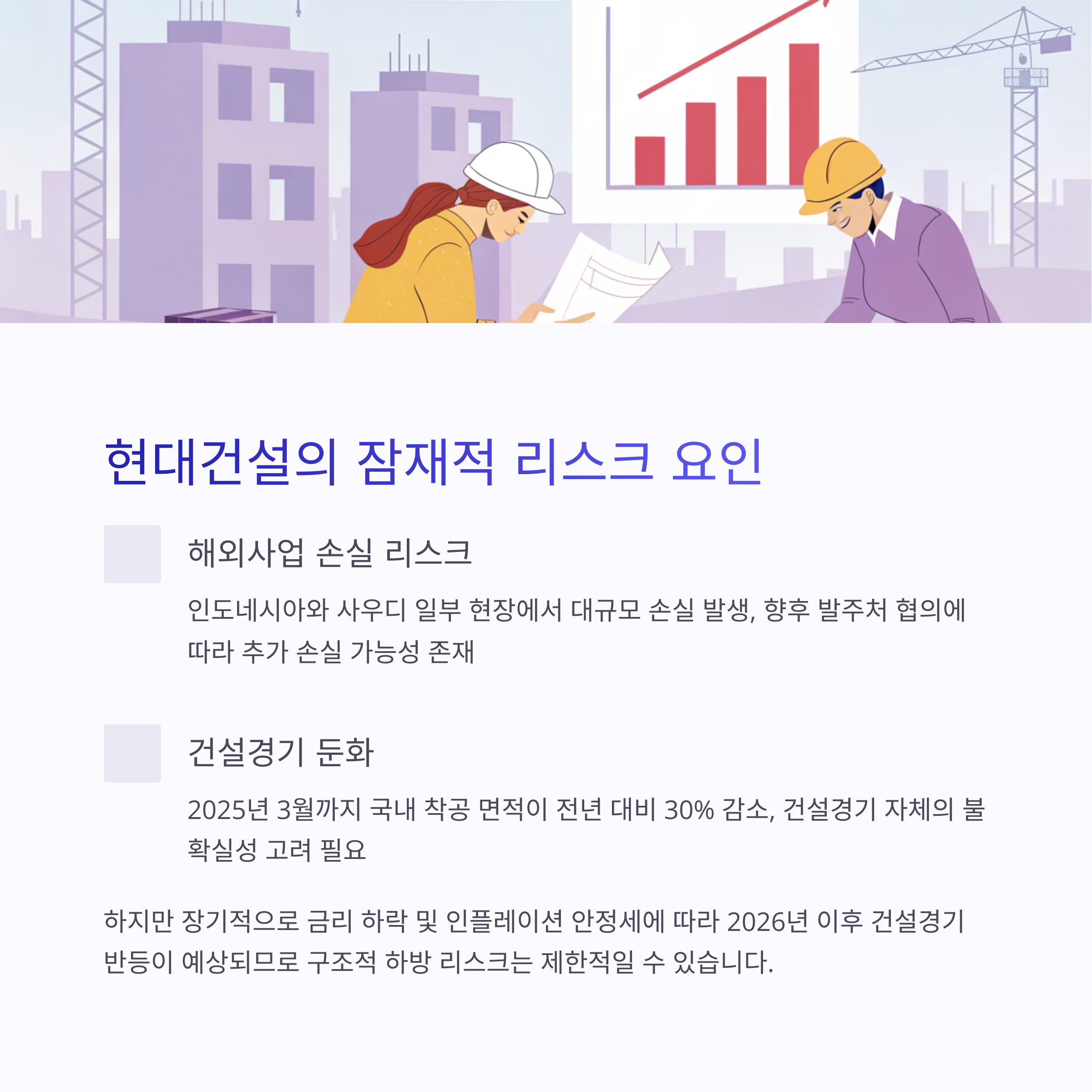 하지만 장기적으로 금리 하락 및 인플레이션 안정세에 따라 2026년 이후 건설경기 반등이 예상되므로 구조적 하방 리스크는 제한적일 수 있습니다.