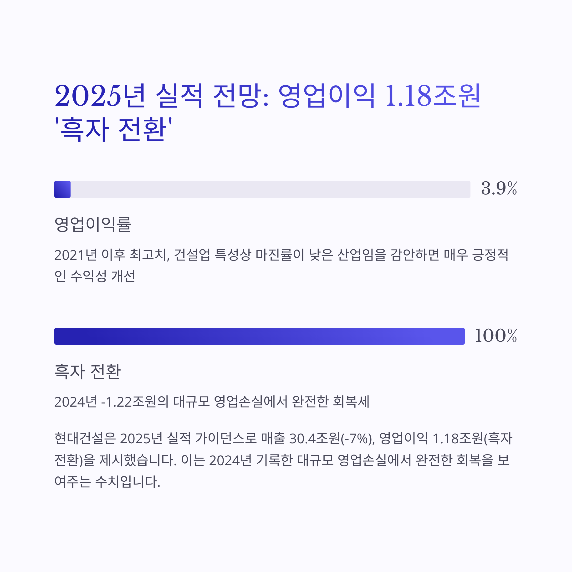 현대건설은 2025년 실적 가이던스로 매출 30.4조원(-7%), 영업이익 1.18조원(흑자 전환)을 제시했습니다. 이는 2024년 기록한 -1.22조원의 대규모 영업손실에서 완전한 회복세를 보여주는 수치입니다.