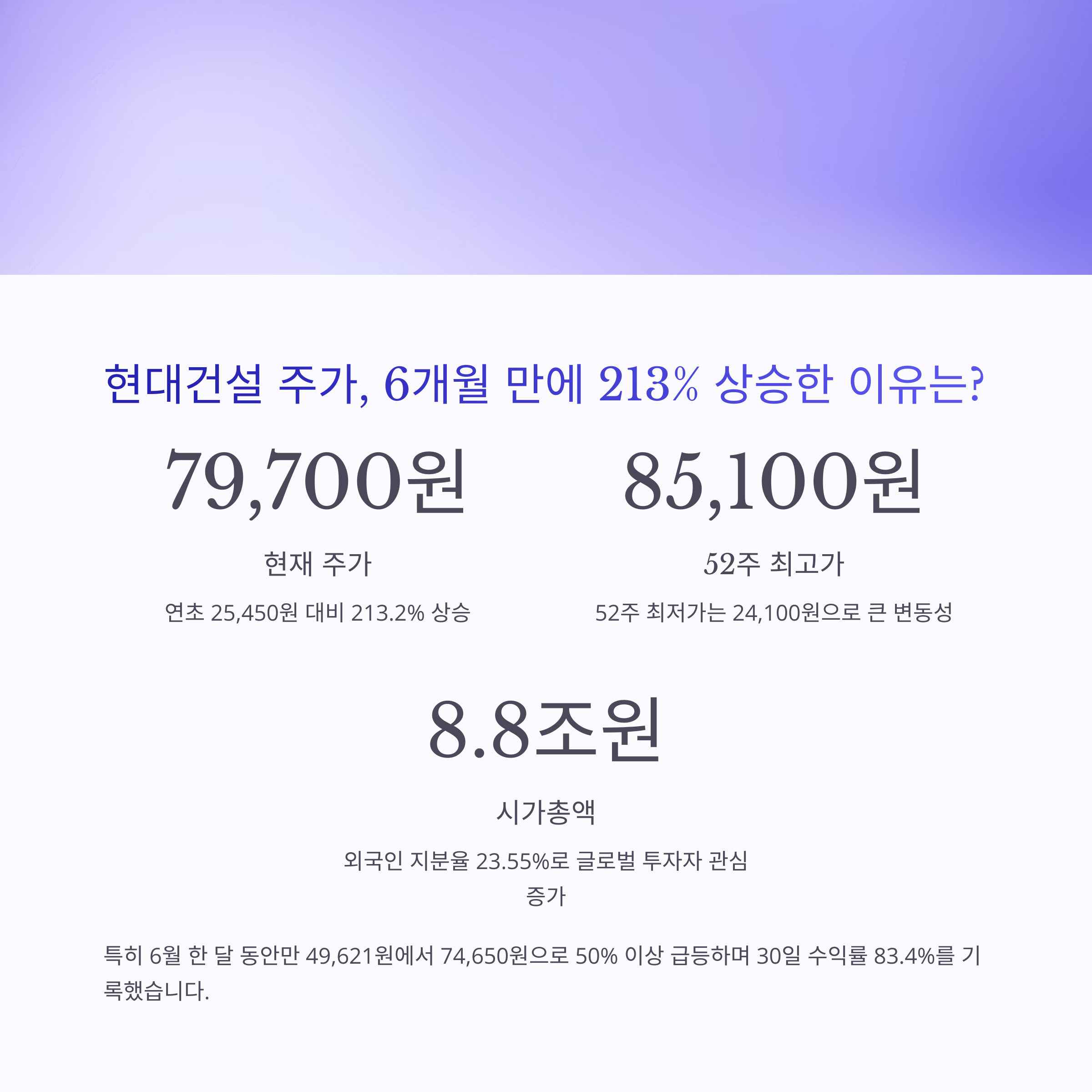 2025년 6월 27일 기준 현대건설의 주가는 79,700원으로, 연초 25,450원 대비 무려 213.2% 상승했습니다. 특히 6월 한 달 동안만 49,621원에서 74,650원으로 50% 이상 급등하면서 30일 수익률만 **83.4%**를 기록했습니다. 52주 최고가는 85,100원, 최저가는 24,100원으로 변동성이 크지만, 현재 시가총액은 약 8.8조원에 달하며 외국인 지분율도 **23.55%**에 이를 정도로 글로벌 투자자들의 관심도 큽니다.