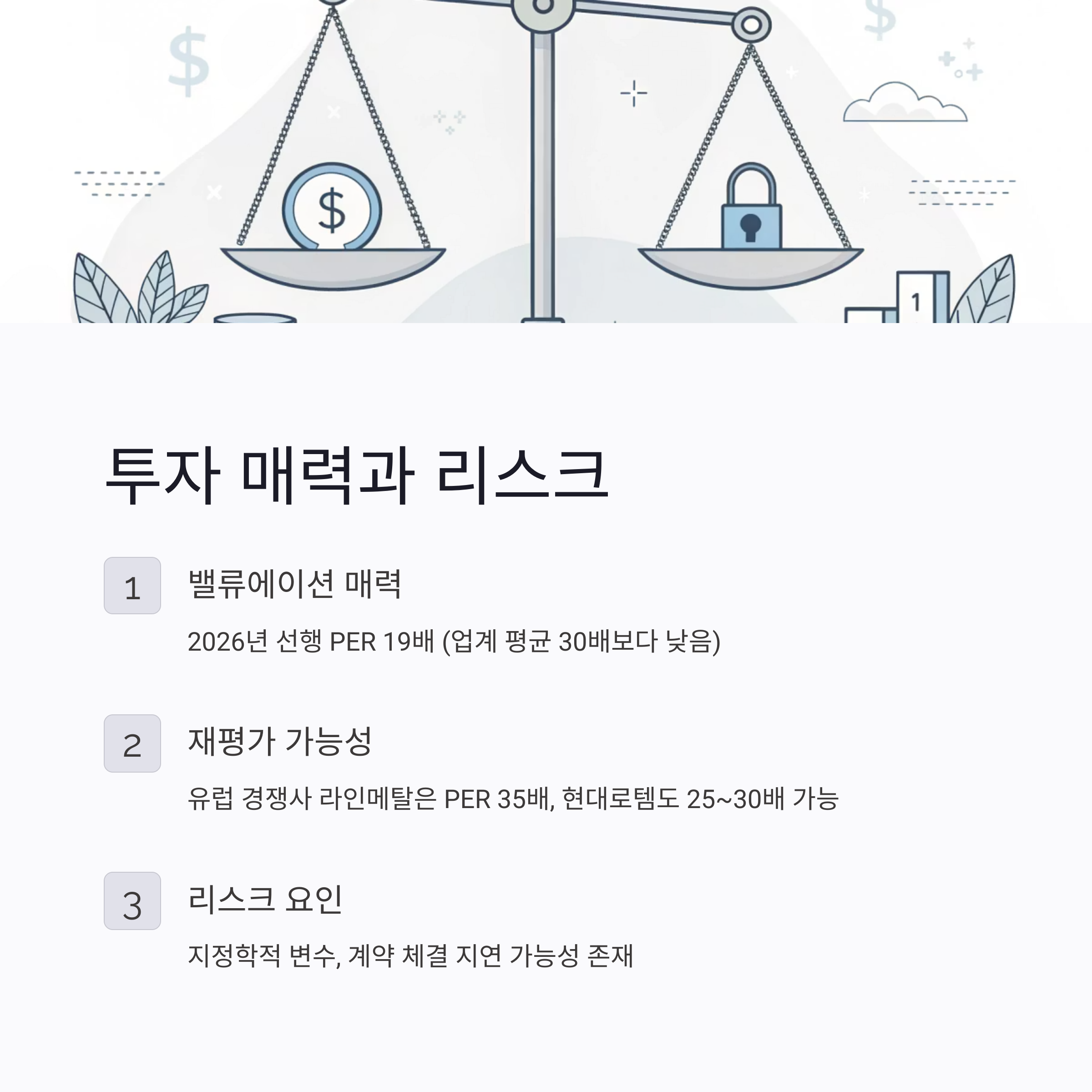 현대로템은 현재 주가 기준으로 2026년 선행 PER 19배 수준이며, 이는 방산업계 평균인 30배보다 낮아 저평가 매력이 있습니다. 유럽의 라인메탈(Rheinmetall)은 PER이 35배까지 평가받고 있어, 유사한 실적 트랙과 수주 규모를 따라간다면 현대로템 역시 PER 25~30배 재평가 가능성이 큽니다.