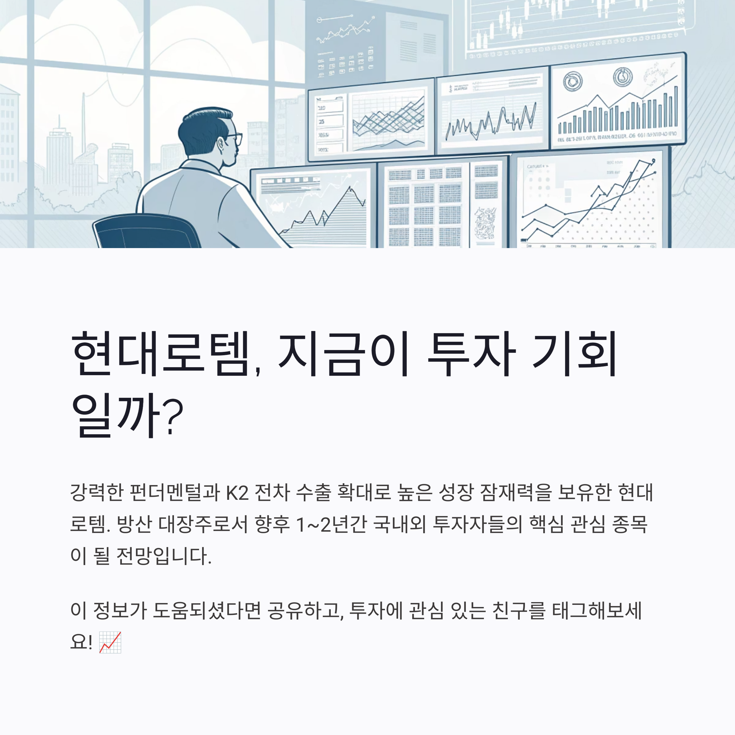 투자에 앞서 방산주 특유의 리스크를 충분히 고려하고, 분할 매수 또는 목표가 설정을 통한 전략적인 접근이 필요합니다. 향후 1~2년간 현대로템은 방산 대장주로서 국내외 투자자들의 핵심 관심 종목이 될 가능성이 높습니다.