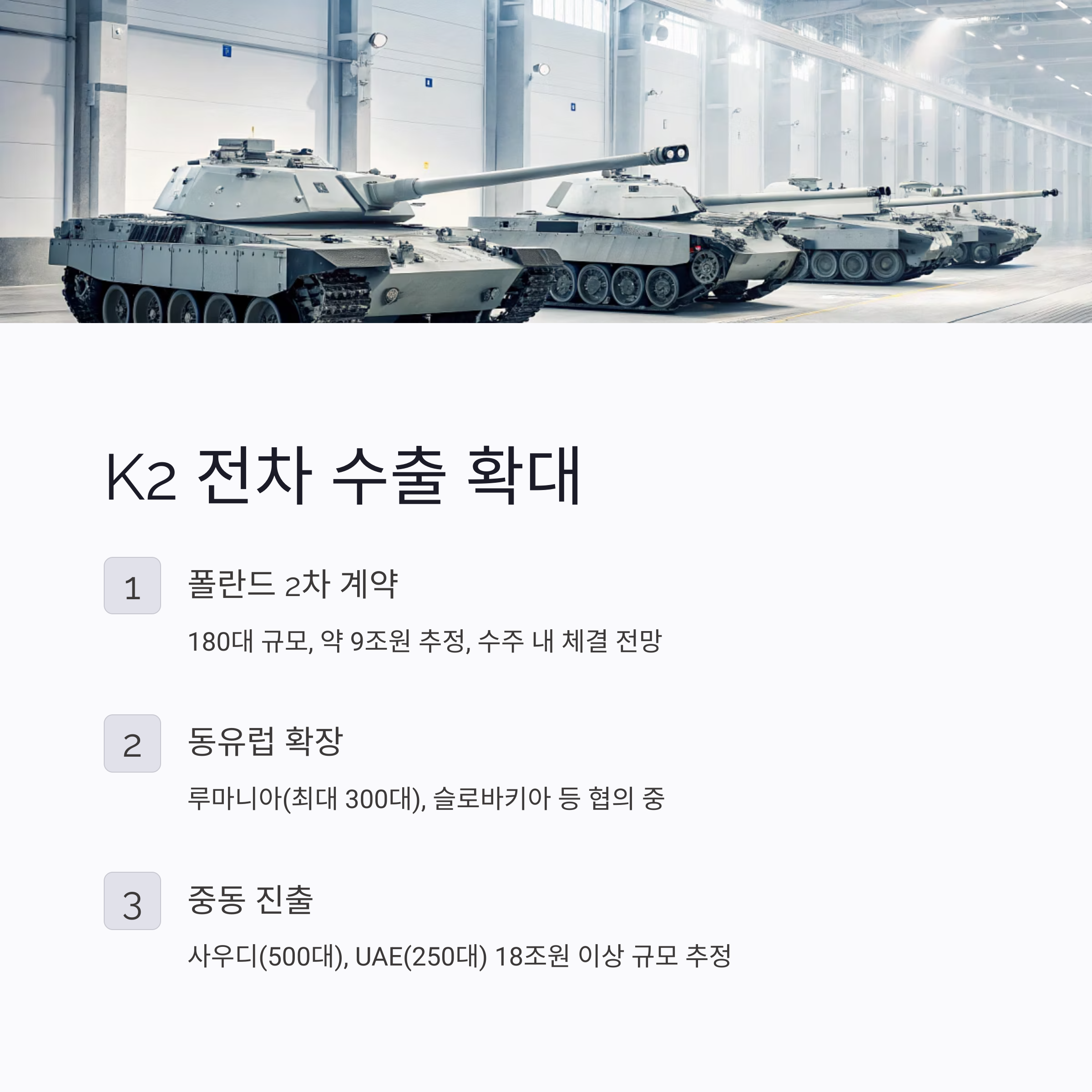더 나아가 루마니아, 슬로바키아 등 동유럽 국가로의 전차 수출도 가시화되고 있습니다. 루마니아는 최대 300대 규모의 전차 구매를 계획 중이며, 계약 시점은 2025년 하반기 국방예산 확정 이후로 예상됩니다. 슬로바키아도 적극적인 협의 대상국으로 분류되며, 유럽 내 입지를 확대하고 있습니다.