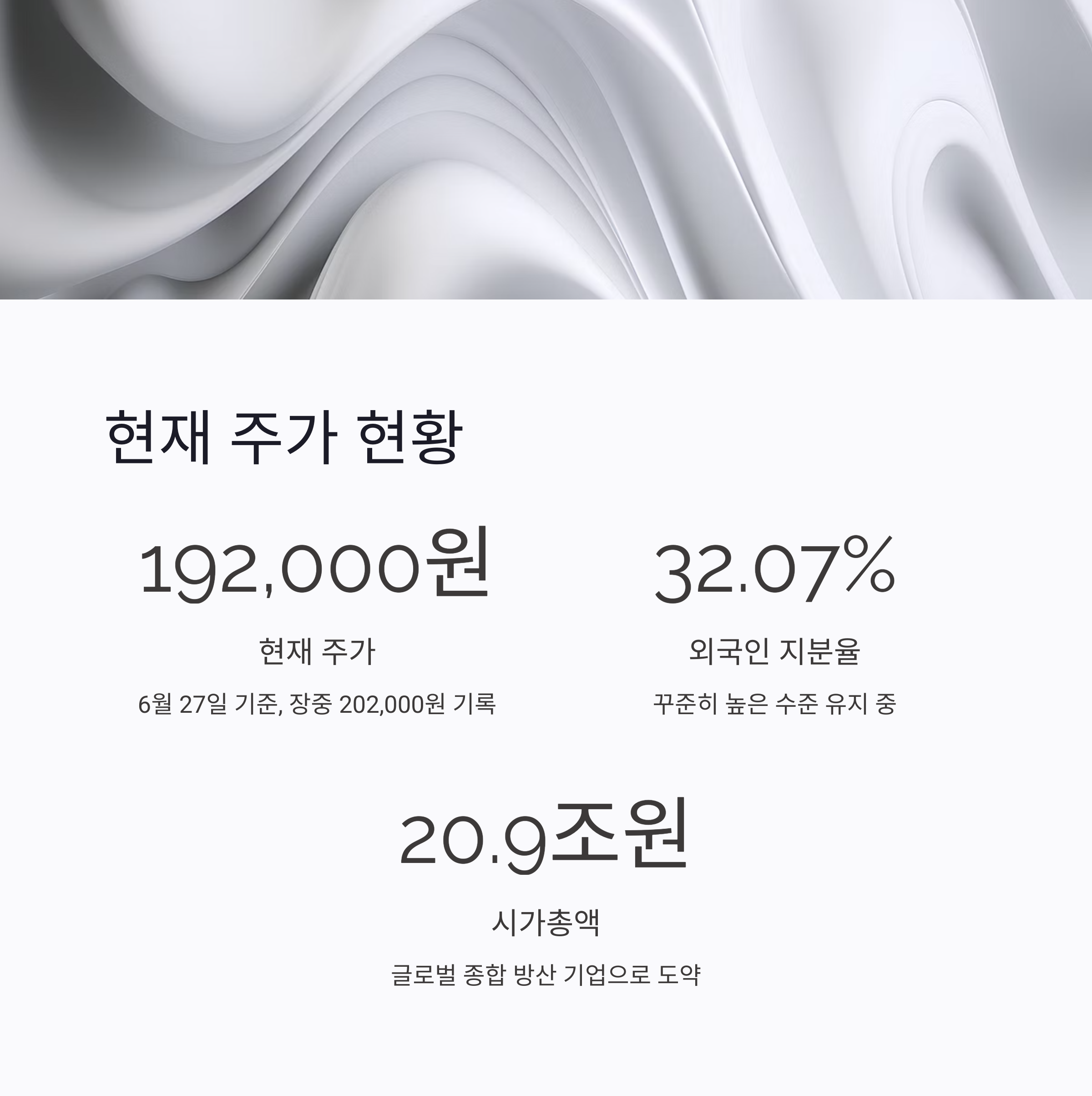 현대로템 주가는 2025년 6월 말 기준으로 강한 상승세를 보이고 있습니다. 6월 27일 기준 주가는 192,000원 수준에서 거래되고 있으며, 장중 한때 202,000원을 기록하는 등 시장의 관심을 집중시키고 있습니다. 외국인 지분율도 32.07%로 꾸준히 높은 수준을 유지하고 있으며, 시가총액은 무려 20조 9,553억 원에 달합니다. 현대로템은 단순한 철도·방산 업체를 넘어 글로벌 종합 방산 기업으로 변모하고 있으며, 그에 따라 주가도 새로운 레벨로 올라서고 있다는 분석이 많습니다.