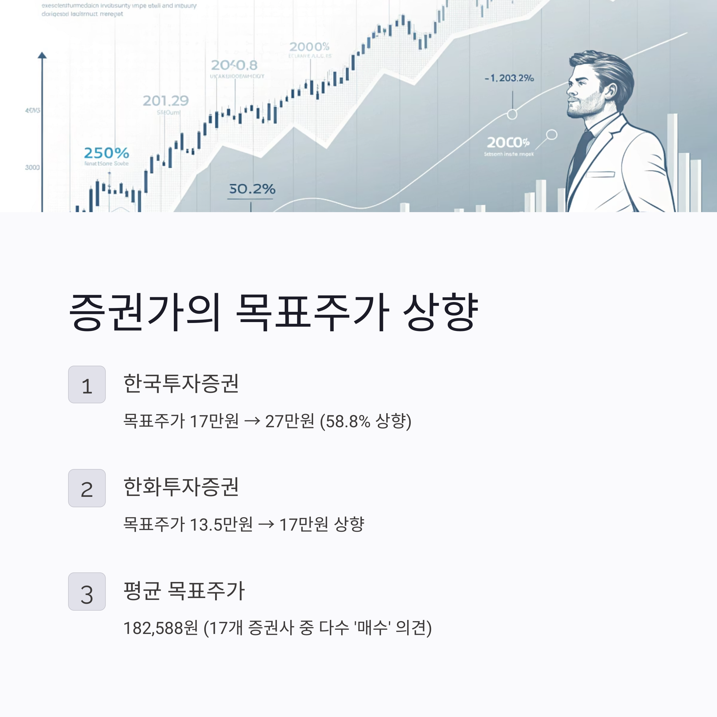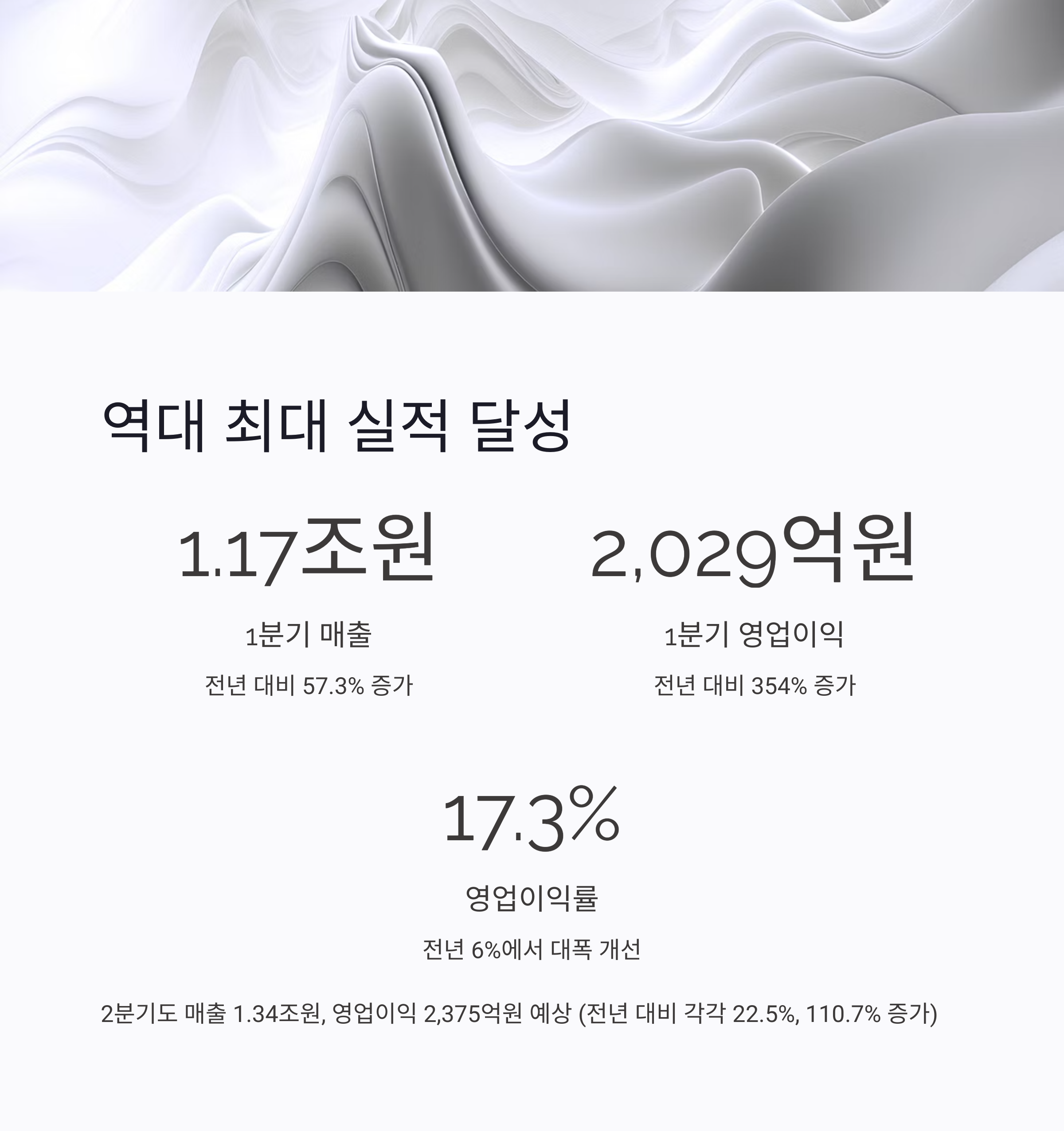 2분기 전망 역시 밝습니다. 한화투자증권은 2025년 2분기 매출 1조 3,403억 원, 영업이익 2,375억 원을 예상하며, 이는 전년 동기 대비 각각 22.5%, 110.7% 증가한 수치입니다. 한국투자증권은 더 높은 매출과 이익을 예상하며 기대감을 키우고 있습니다.