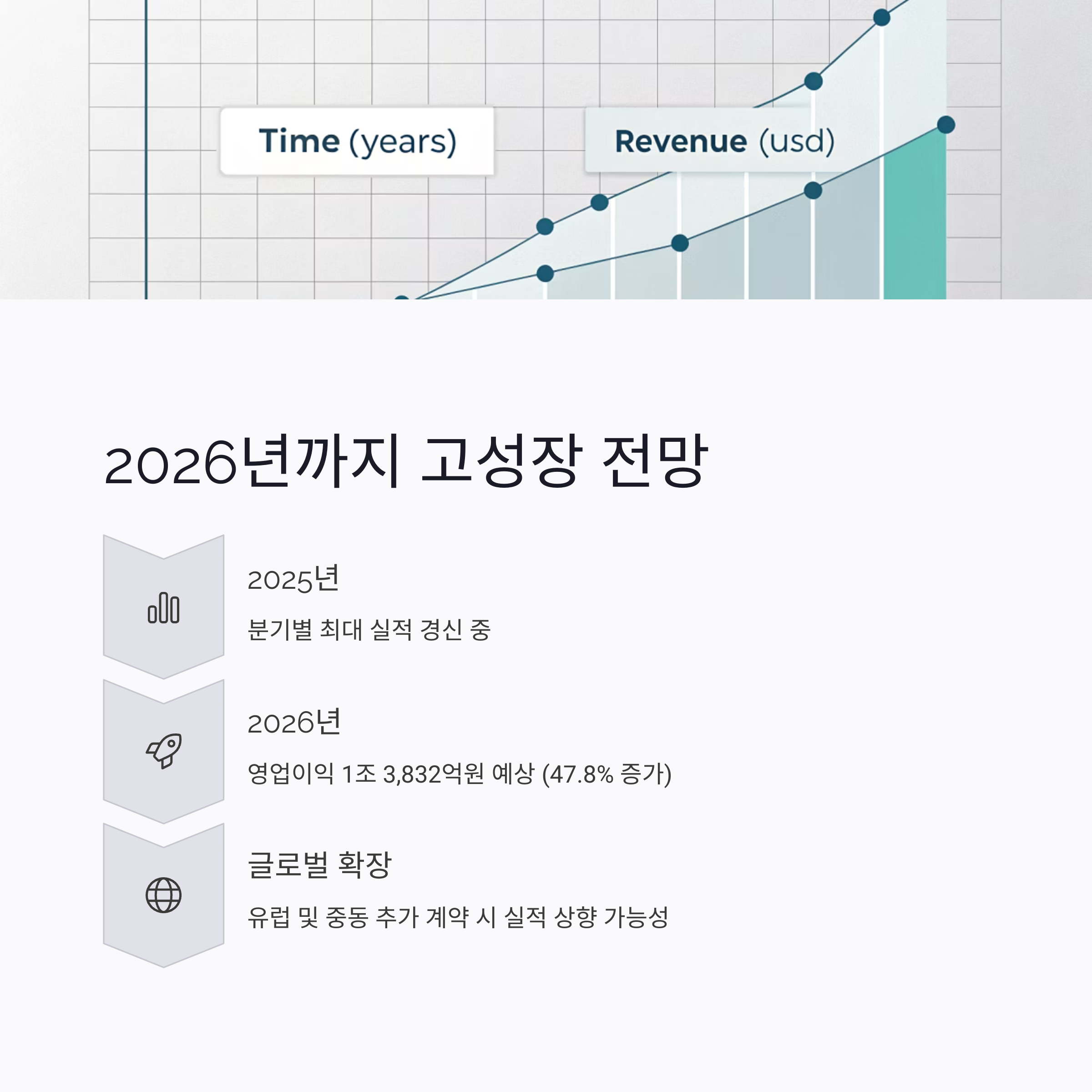 증권가의 전망에 따르면, 현대로템의 성장은 단기적 이슈에 그치지 않습니다. 한국투자증권은 2026년 영업이익을 1조 3,832억 원으로 예상하고 있으며, 이는 2025년 대비 47.8% 증가한 수치입니다. 한화투자증권도 2026년 매출 6조 원, 영업이익 1조 771억 원을 제시하며 긍정적인 시각을 보였습니다.