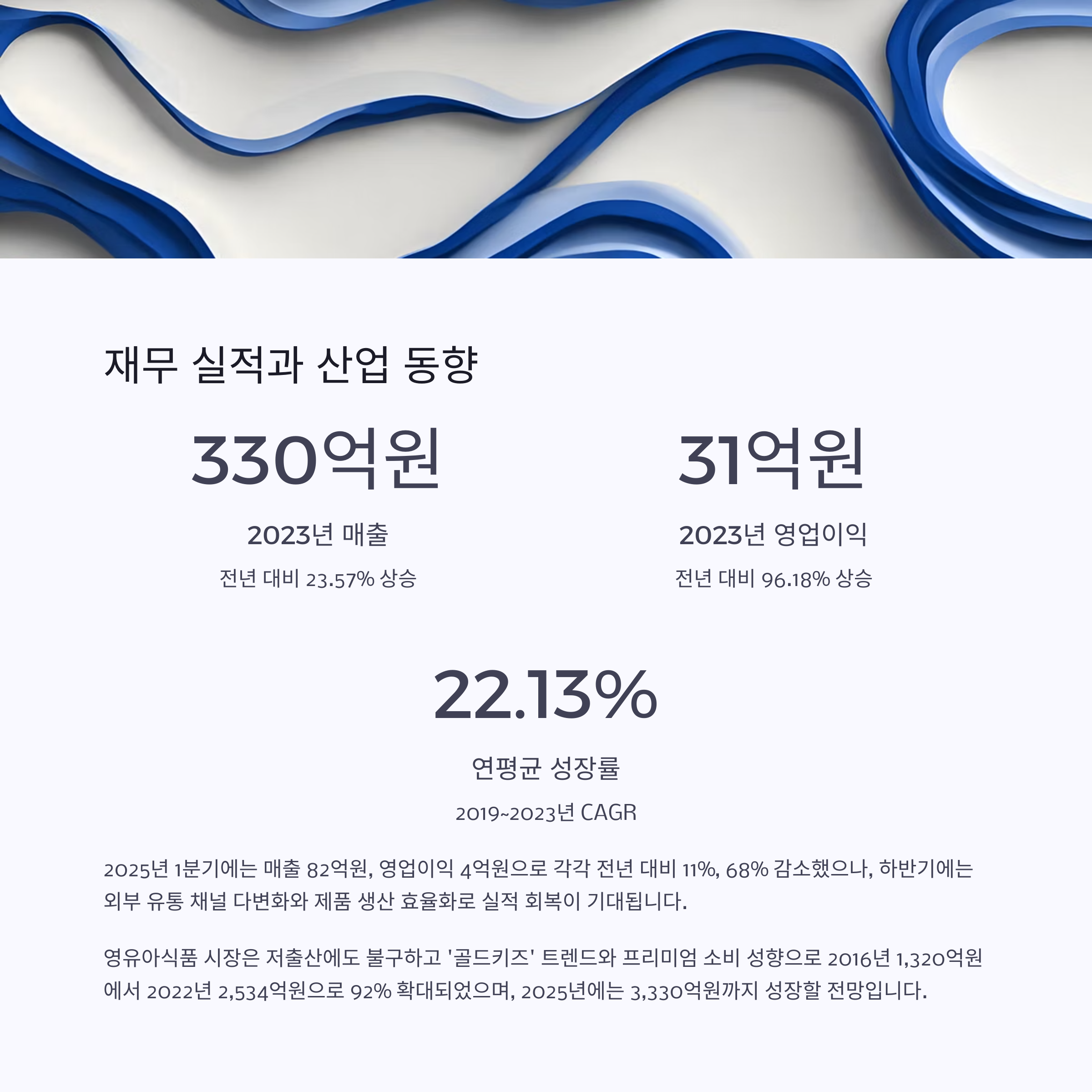 에르코스가 속한 영유아식품 시장은 저출산이라는 구조적 한계에도 불구하고, ‘골드키즈’ 트렌드와 프리미엄 소비 성향에 따라 꾸준히 성장하고 있습니다. 실제로 분유를 제외한 국내 영유아식 시장은 2016년 1,320억원에서 2022년 2,534억원으로 약 92% 확대되었으며, 2025년에는 3,330억원까지 성장할 것으로 전망됩니다.