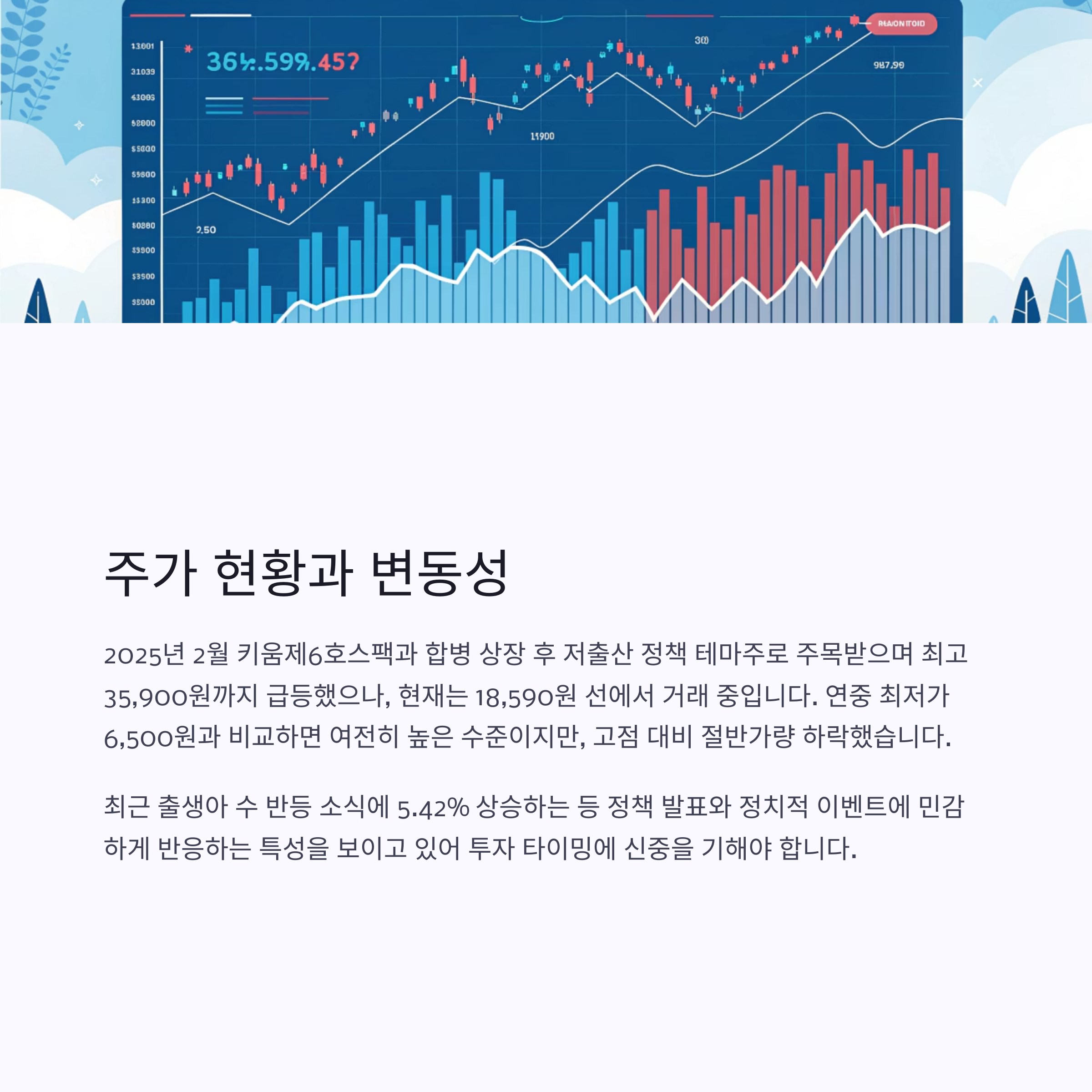 최근 6월 26일에는 출생아 수 반등 소식이 전해지며 전 거래일 대비 5.42% 상승한 19,060원에 마감하는 등 테마주 성격의 변동성이 뚜렷하게 나타납니다. 따라서 투자자라면 정책 발표 및 정치적 이벤트와 같은 외부 이슈에 민감한 종목임을 인식하고, 타이밍에 신중을 기해야 합니다.