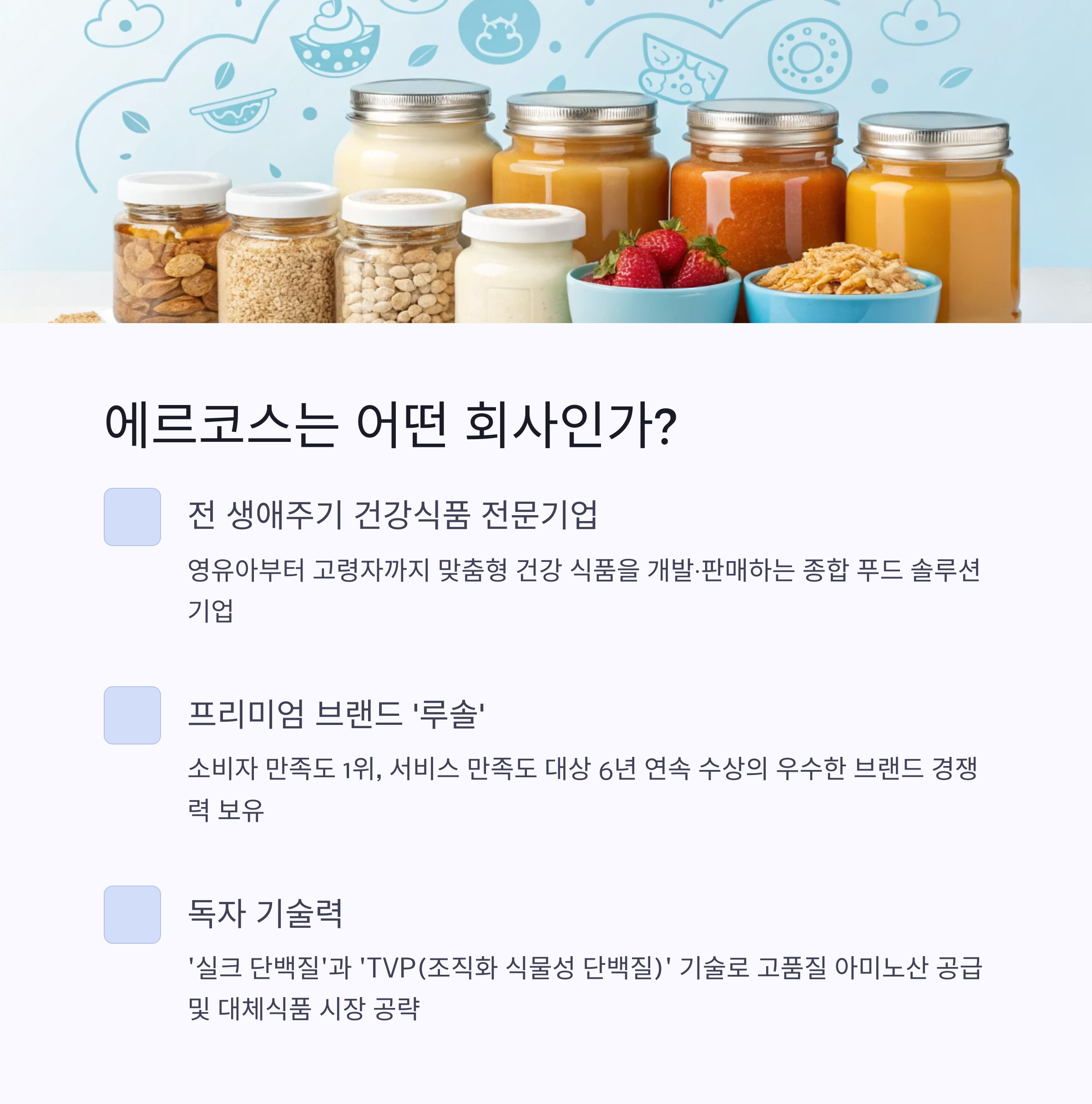 에르코스는 영유아에서 고령자까지 전 생애 주기별 건강 식품을 개발·판매하는 식품 전문 기업입니다. 주력 브랜드인 ‘루솔(LUSOL)’은 프리미엄 이유식 시장에서 소비자 만족도 1위, 서비스 만족도 대상 6년 연속 수상 등 우수한 브랜드 경쟁력을 입증해왔습니다. 뿐만 아니라 고령친화식품, 건강즙, 식물성 단백질 제품, 온라인 쇼핑몰 운영 등으로 사업 영역을 다각화하며 성장 동력을 확보하고 있습니다.