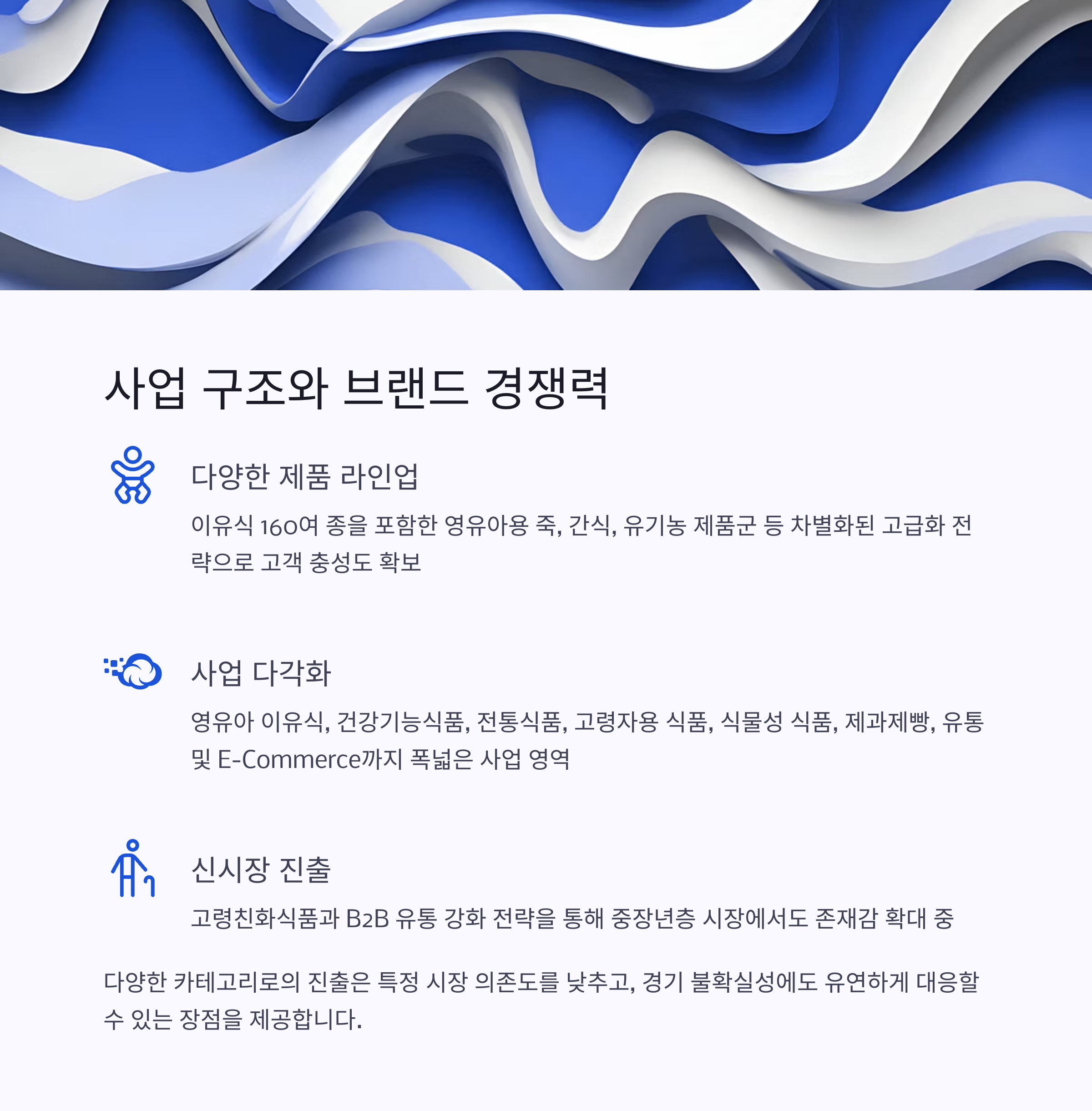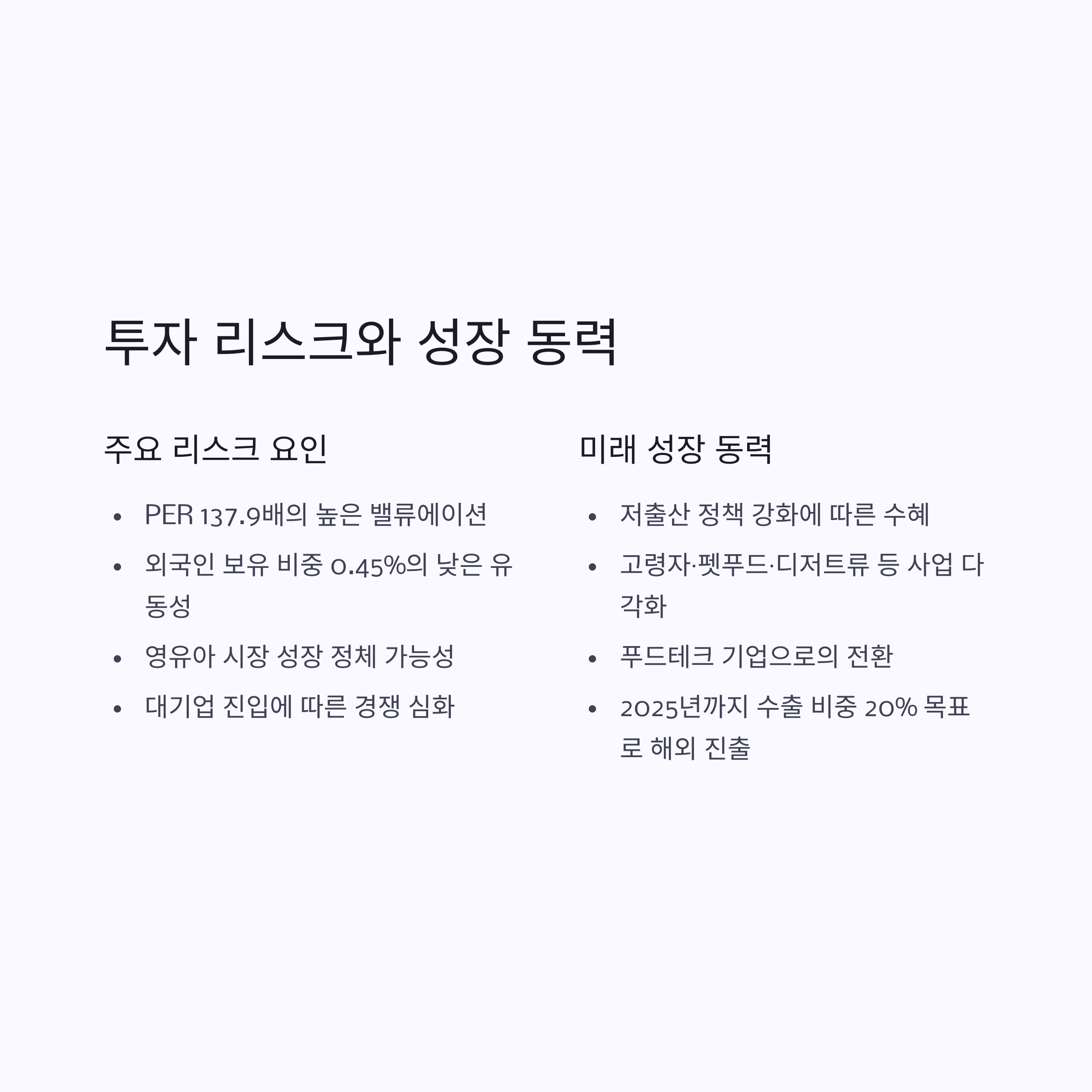 둘째, 고령자·펫푸드·디저트류 등으로의 사업 다각화를 통해 신시장 진출을 추진 중입니다.