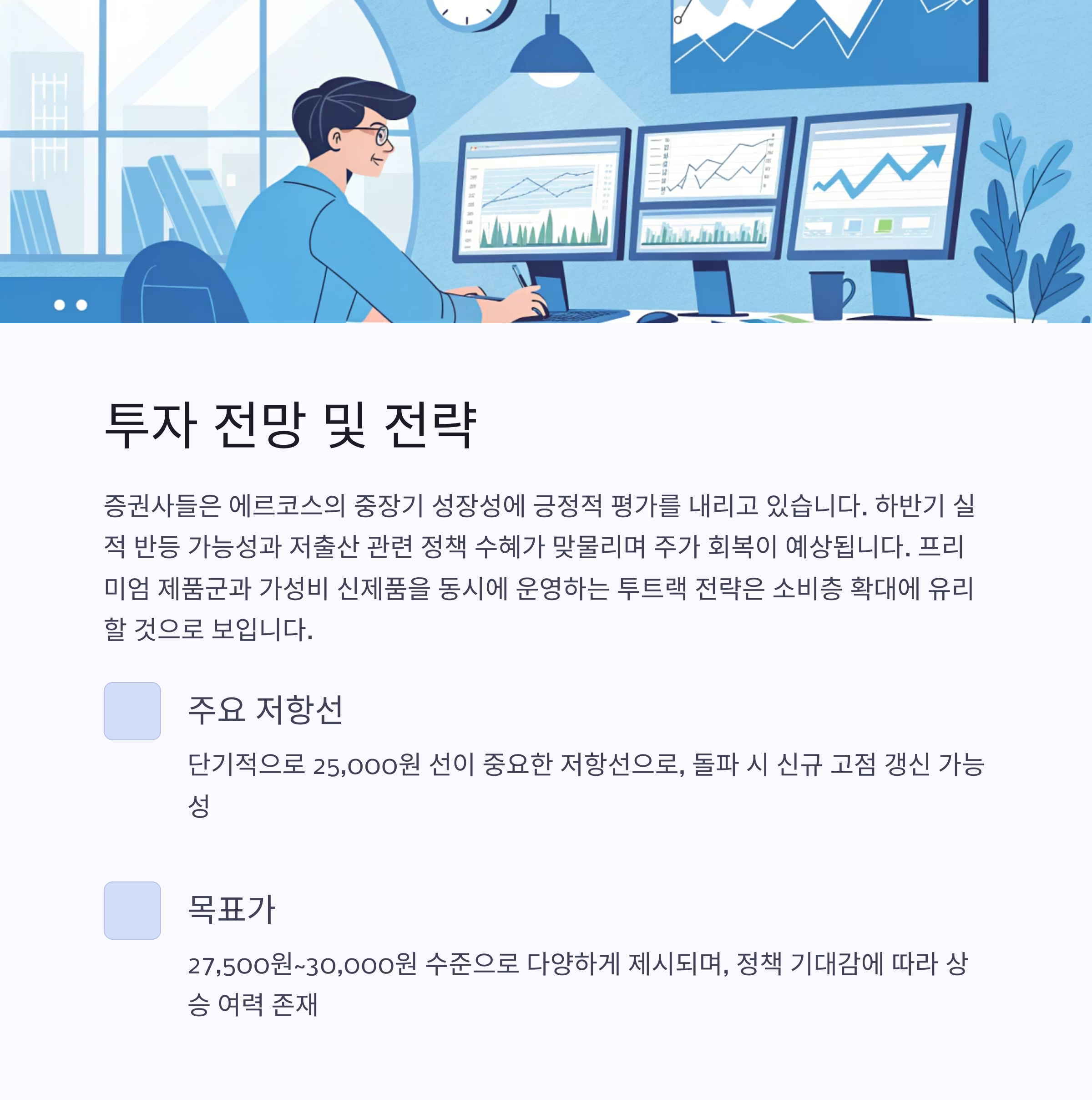 다수 증권사 및 투자 전문가들은 에르코스의 중장기 성장성에 대해 긍정적인 평가를 내리고 있습니다. 하반기에는 실적 반등 가능성과 저출산 관련 정책의 수혜 기대가 맞물리며 주가 회복 가능성이 높다고 전망됩니다. 특히 프리미엄 제품군 확대 및 가성비 신제품 라인업을 동시에 운영하는 투트랙 전략은 소비층 확대에 유리하게 작용할 수 있습니다.