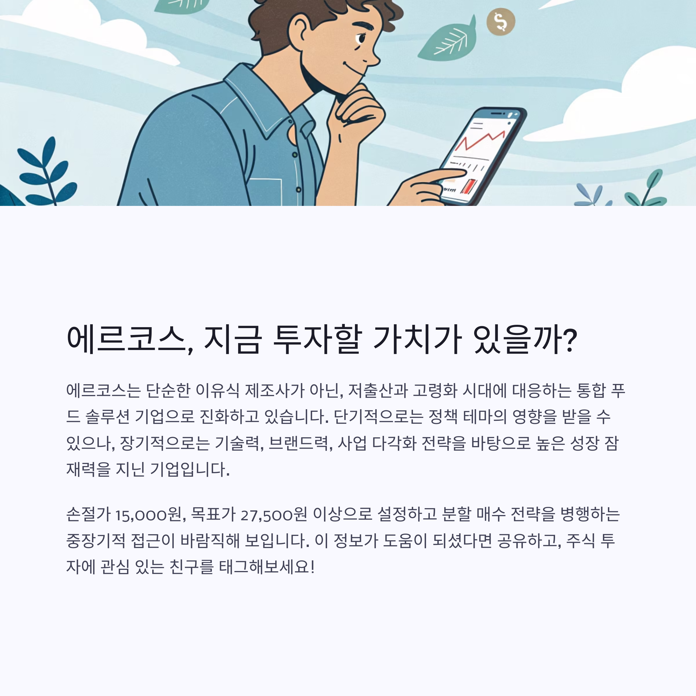 에르코스는 단순한 이유식 제조사가 아닌, 저출산과 고령화 시대에 대응하는 통합 푸드 솔루션 기업으로 진화 중입니다. 단기적으로는 정책 테마의 영향을 받을 수 있으나, 장기적으로는 기술력, 브랜드력, 사업 다각화 전략을 바탕으로 높은 성장 잠재력을 지닌 기업입니다.