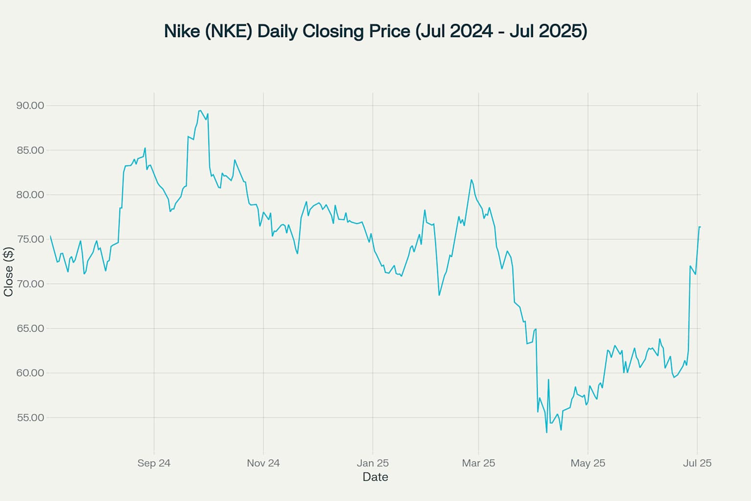 2024년 7월 초 나이키 주가는 약 75달러에서 시작했습니다. 연말과 2025년 초에는