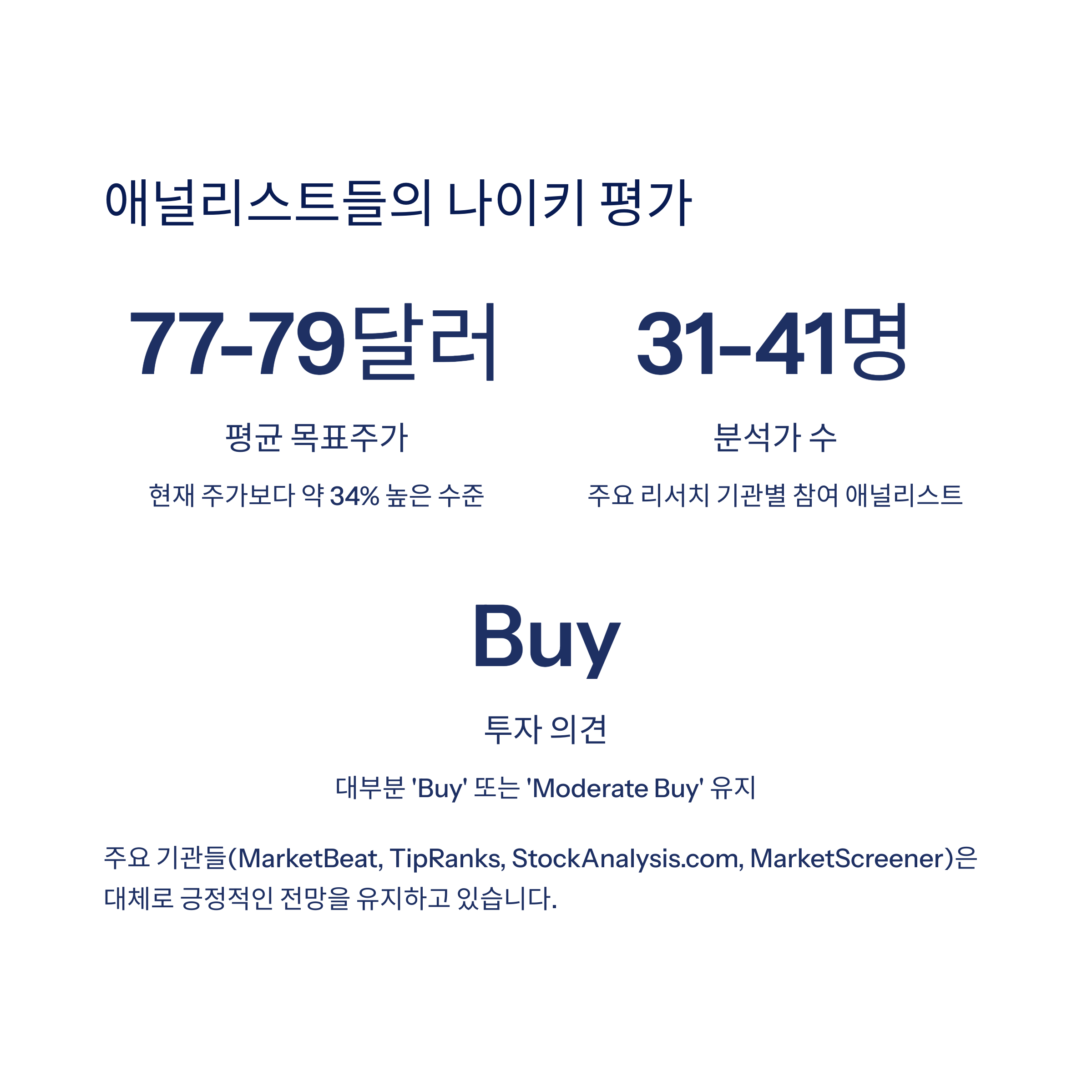 대체로 ‘Buy’ 또는 ‘Moderate Buy’를 유지하고 있으며, 평균 목표가는