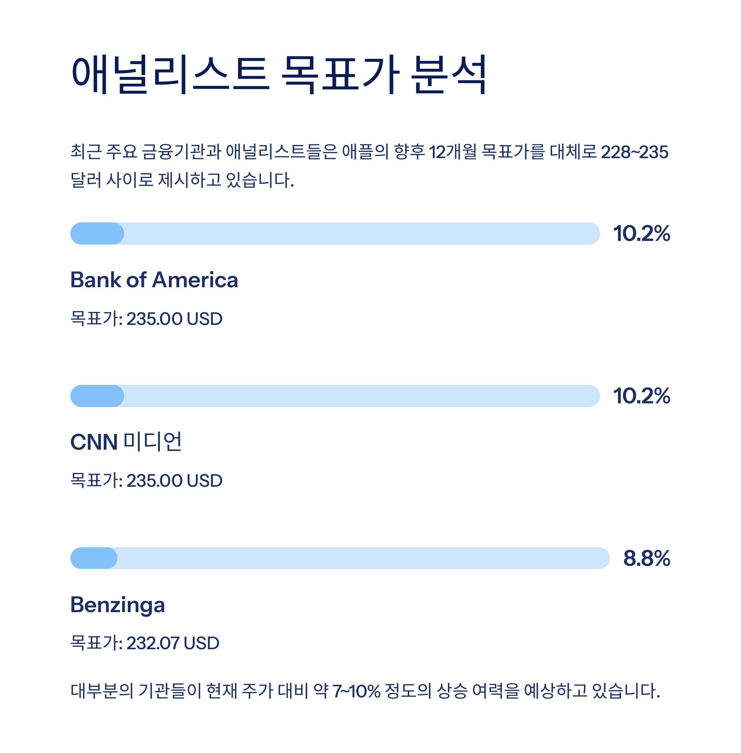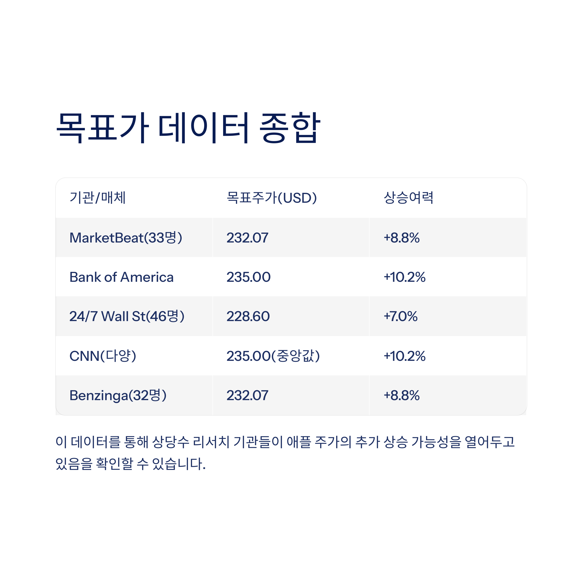 현재 주가(213.34달러) 대비 약 9% 정도의 추가 상승 여력이 있는 것으로 분석됩니다.