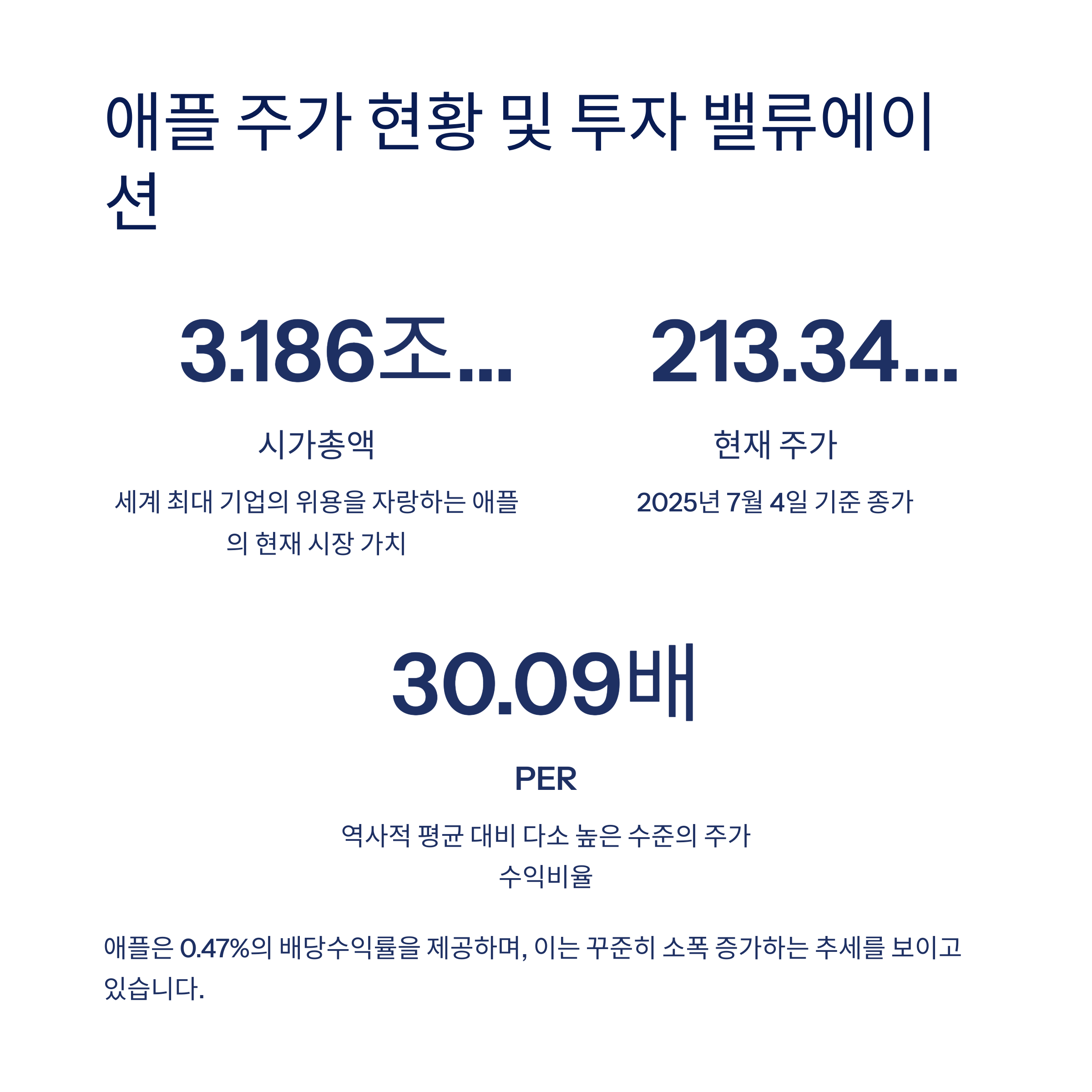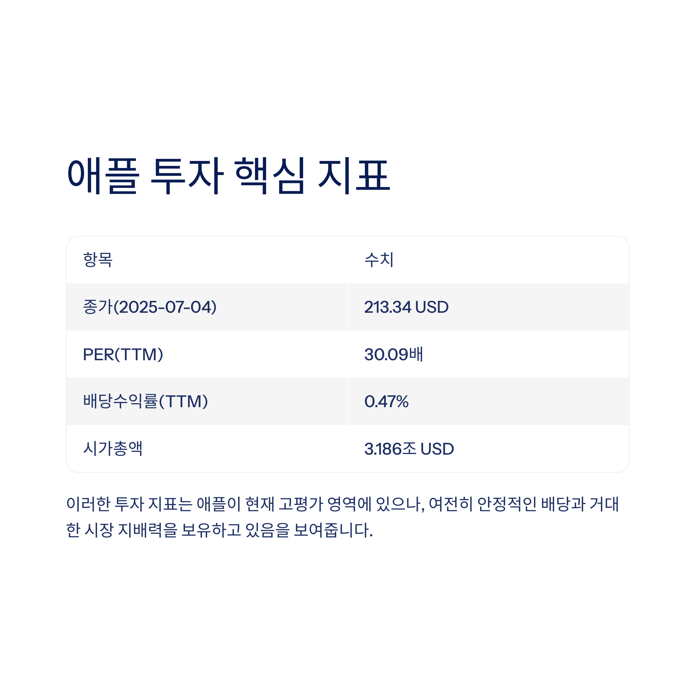 2025년 7월 4일 기준 애플 주가는 213.34달러에 마감했으며