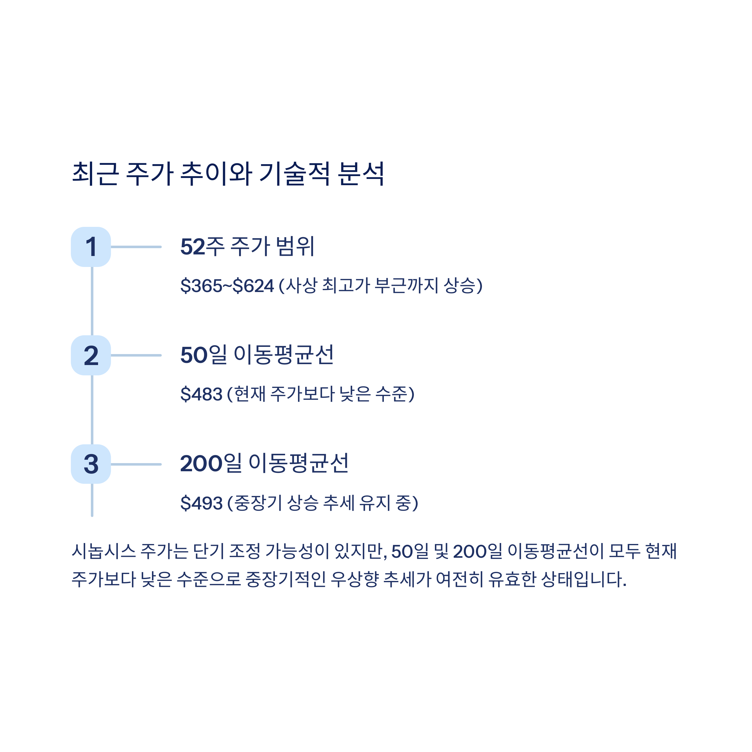 시놉시스(SNPS)는 반도체 설계 자동화(EDA)와 IP 솔루션 분야에서 글로벌 시장을 선도하는 기업으로, 최근 애널리스트들로부터 강력 매수 의견을 다수 받고 있습니다. 현재 주가는 약 $548 수준으로, 향후 12개월 평균 목표주가인 $585를 기준으로 보면 약 6%가량 추가 상승 여력이 있는 것으로 평가되며, 최고가는 $685까지 기대할 수 있습니다. 다만 기술주의 특성상 변동성이 크고, 경쟁사 추격과 거시경제 리스크도 존재하기 때문에 투자 시 주의가 필요합니다.