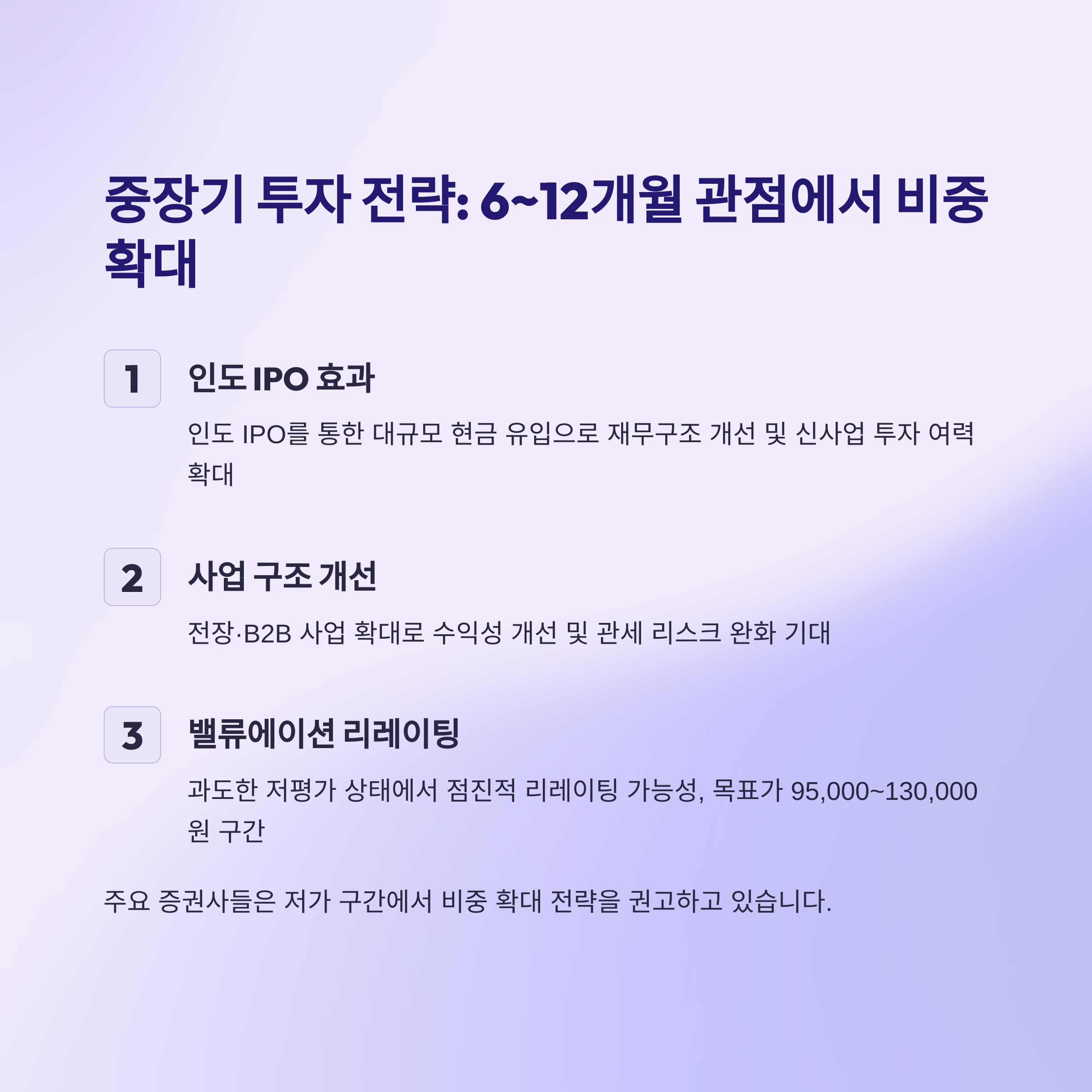 인도 IPO를 통한 현금 유입, 전장·B2B 사업 확대, 밸류에이션 리레이팅 가능성에 주목해볼 만합니다.