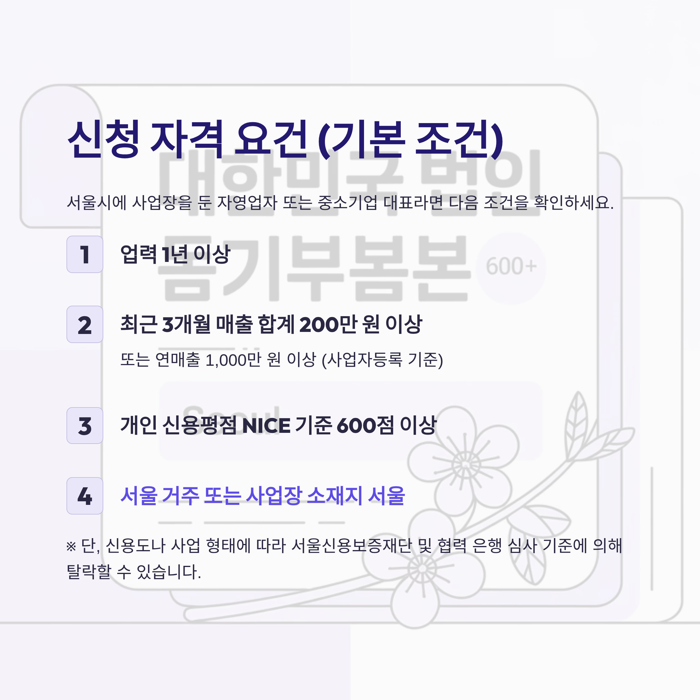 서울시에 사업장을 둔 자영업자 또는 중소기업 대표라면 다음 조건을 확인하세요.