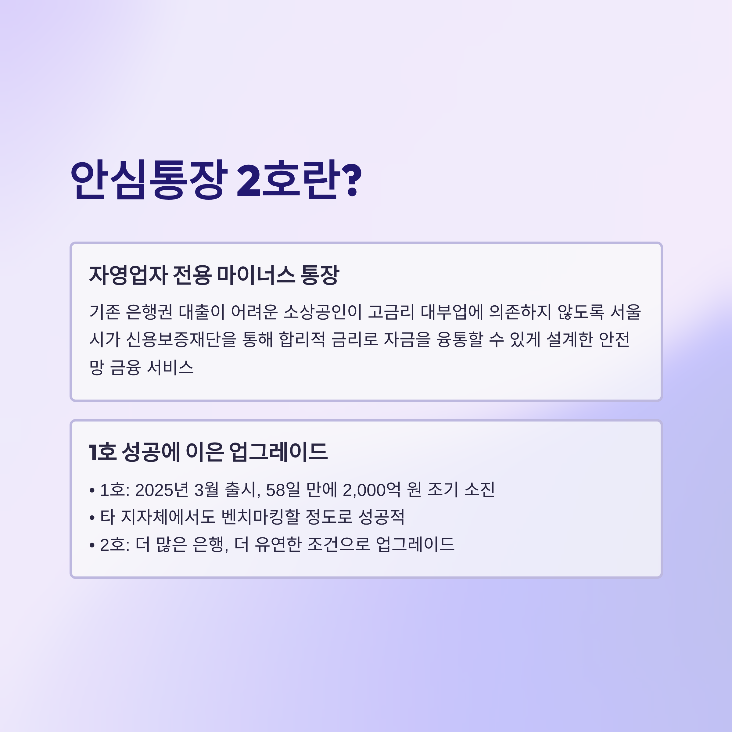 서울시는 이러한 생계형 자영업자를 위해 ‘안심통장’이라는 획기적인 금융 지원 제도를 2025년 상반기에 이어, 하반기에도 ‘안심통장 2호’를 2,000억 원 규모로 재출시합니다.