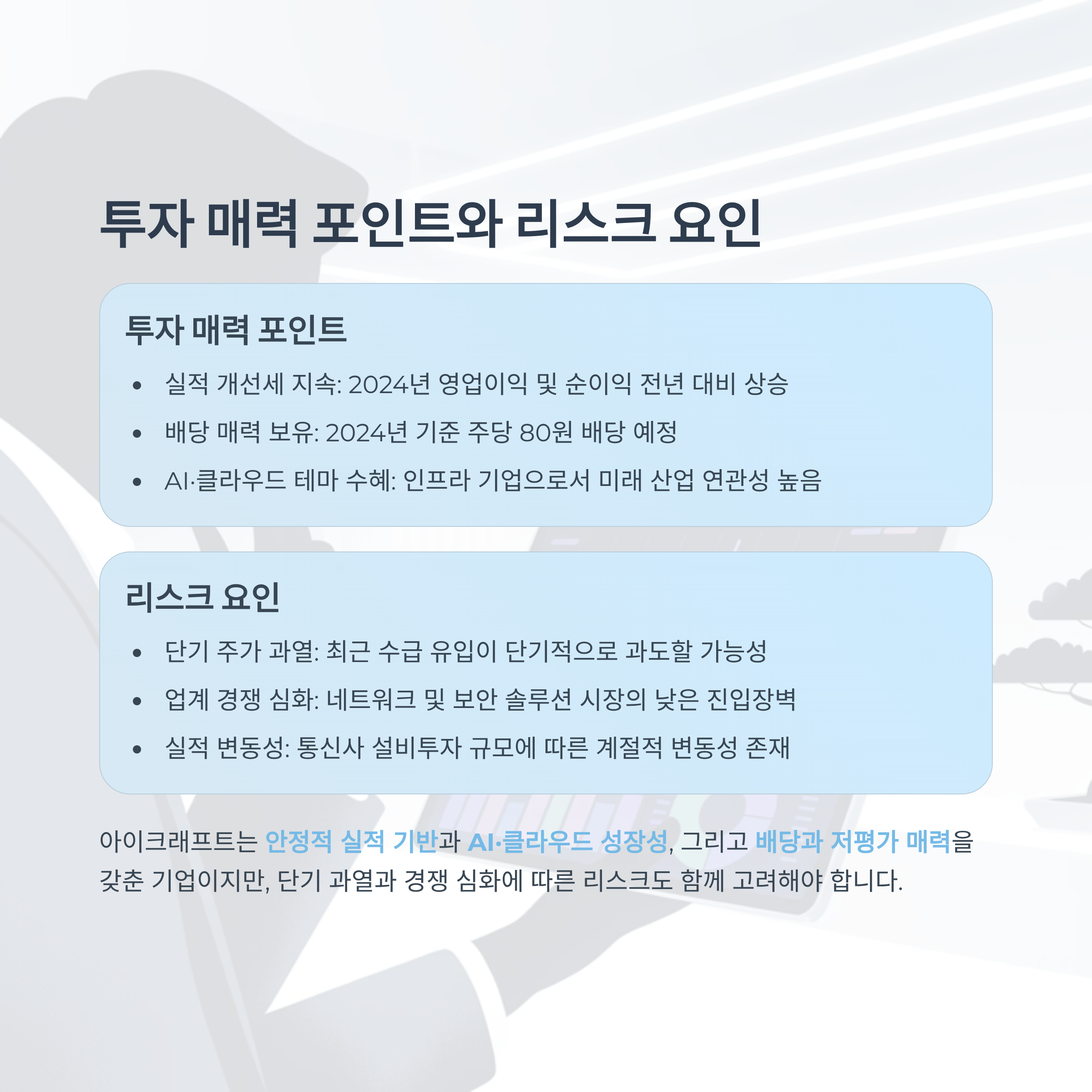 ✅ 실적 개선세 지속: 2024년 기준 영업이익 및 순이익이 전년 대비 상승 중이며, 클라우드 및 보안 솔루션의 성장 기여가 가시화되고 있습니다.