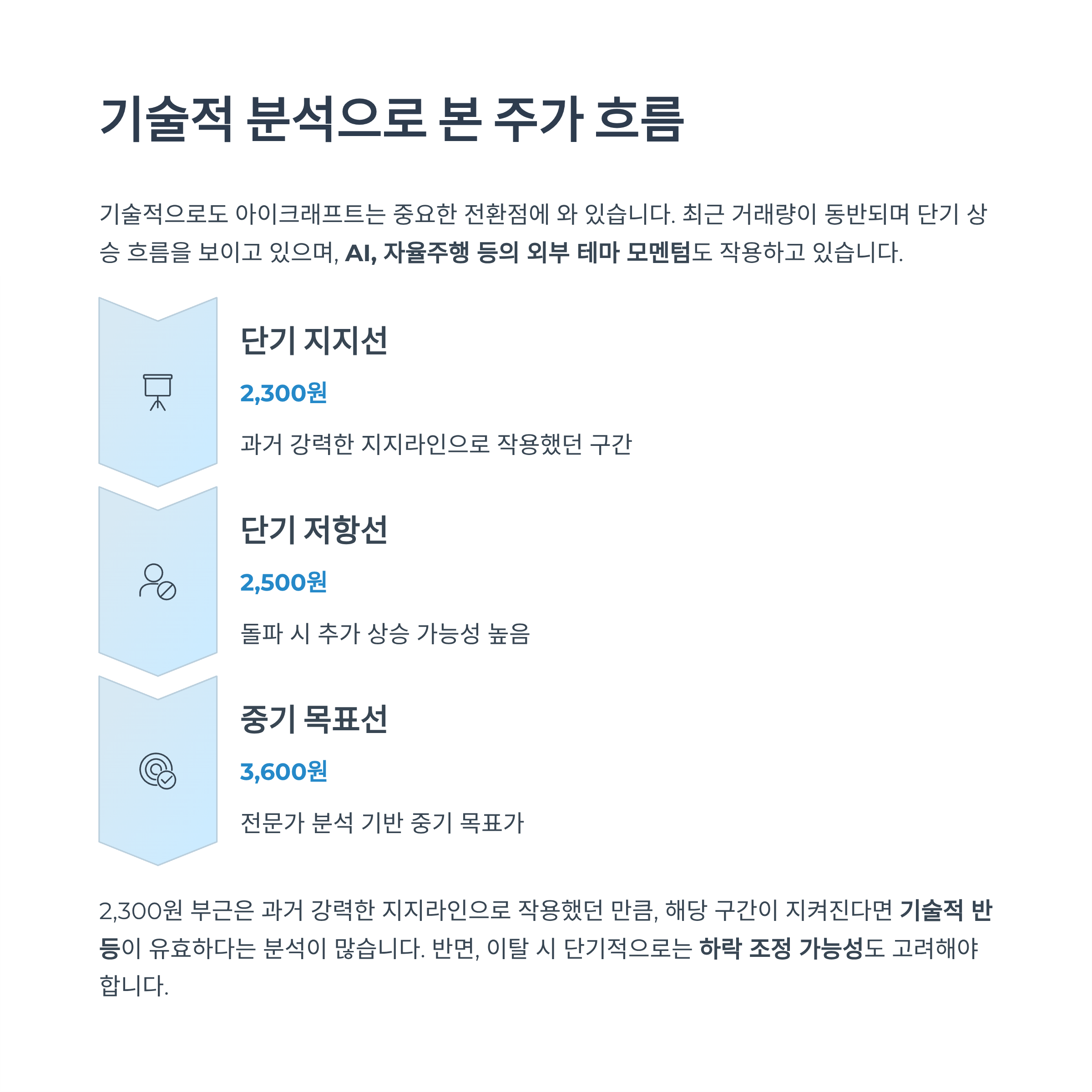 기술적으로는 2,300원~2,500원 구간을 단기 지지·저항선으로 보고, 해당 가격대를 안정적으로 지지할 경우 추가 상승 가능성이 높아집니다.