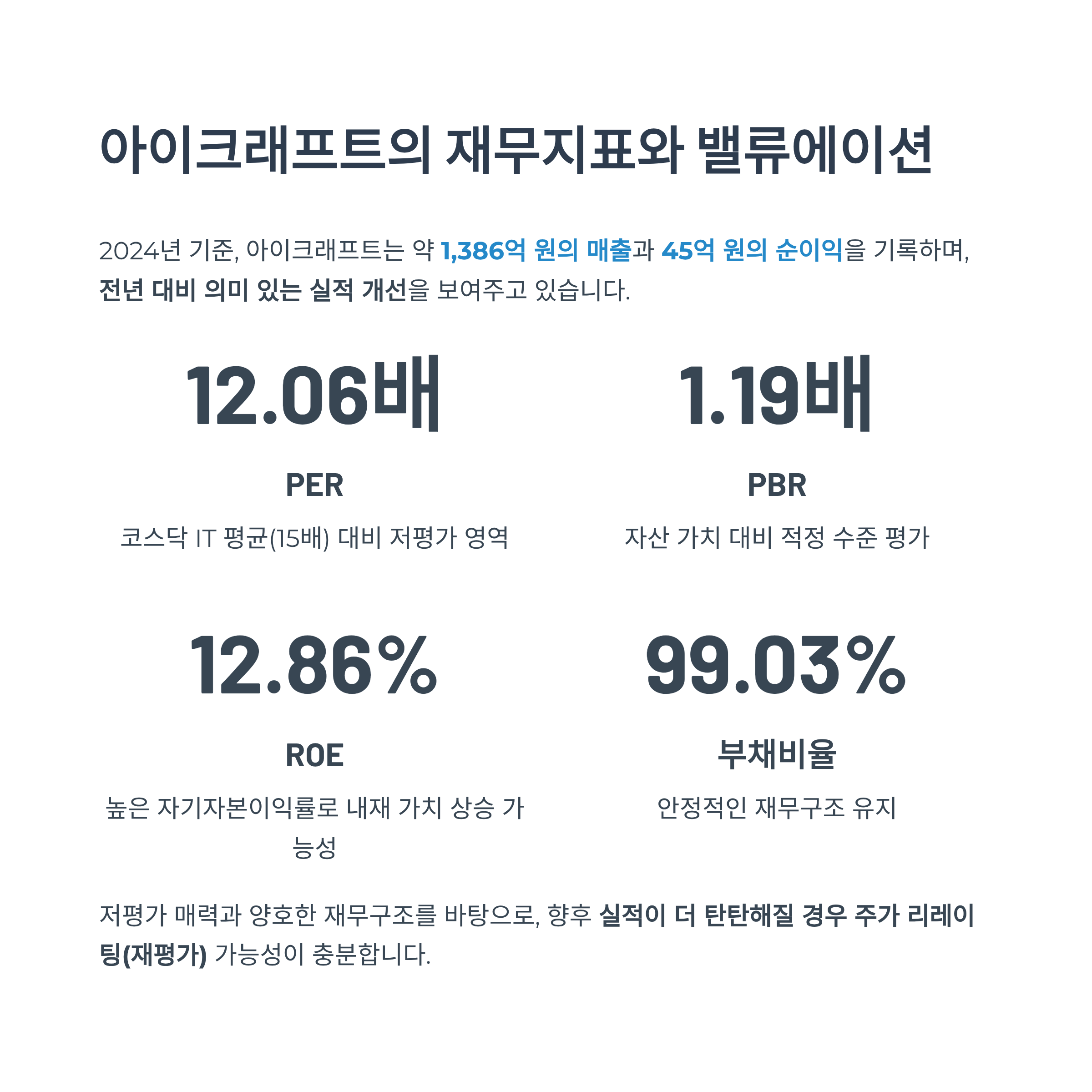 2024년 실적 기준, 아이크래프트는 약 1,386억 원의 매출과 45억 원의 순이익을 기록하며, 전년 대비 의미 있는 실적 개선을 보여주고 있습니다. 아래는 주요 재무지표입니다.