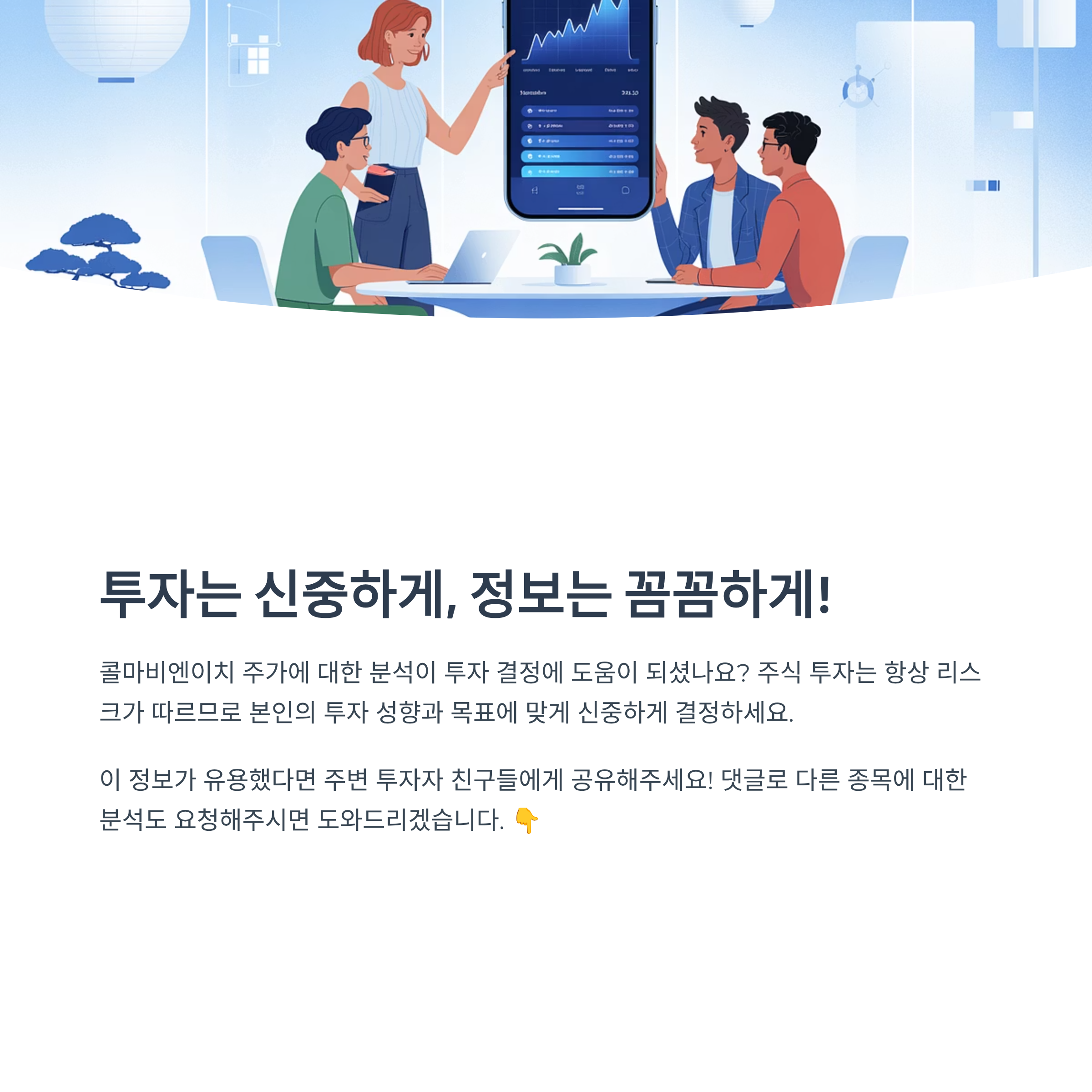 기관과 애널리스트 대부분이 콜마비엔이치의 중장기 성장 가능성을 높게 평가하고 있는 만큼, 리스크 요소를 관리하면서도 밸류에이션 측면에서 긍정적인 관점이 필요한 시점입니다.