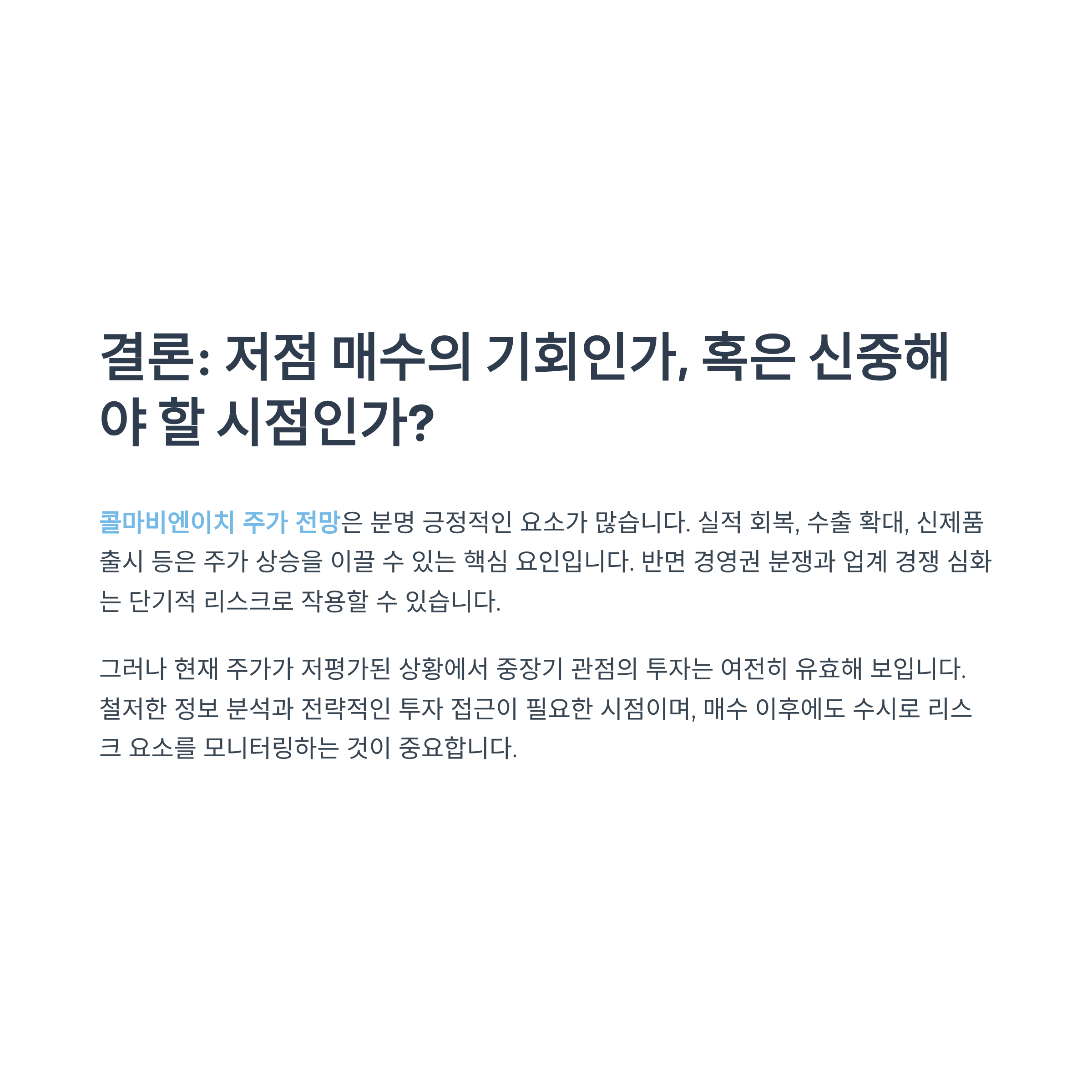 콜마비엔이치 주가 전망은 분명 긍정적인 요소가 많습니다. 실적 회복, 수출 확대, 신제품 출시 등은 주가 상승을 이끌 수 있는 핵심 요인입니다. 반면 경영권 분쟁과 업계 경쟁 심화는 단기적 리스크로 작용할 수 있습니다. 그러나 현재 주가가 저평가된 상황에서 중장기 관점의 투자는 여전히 유효해 보입니다.