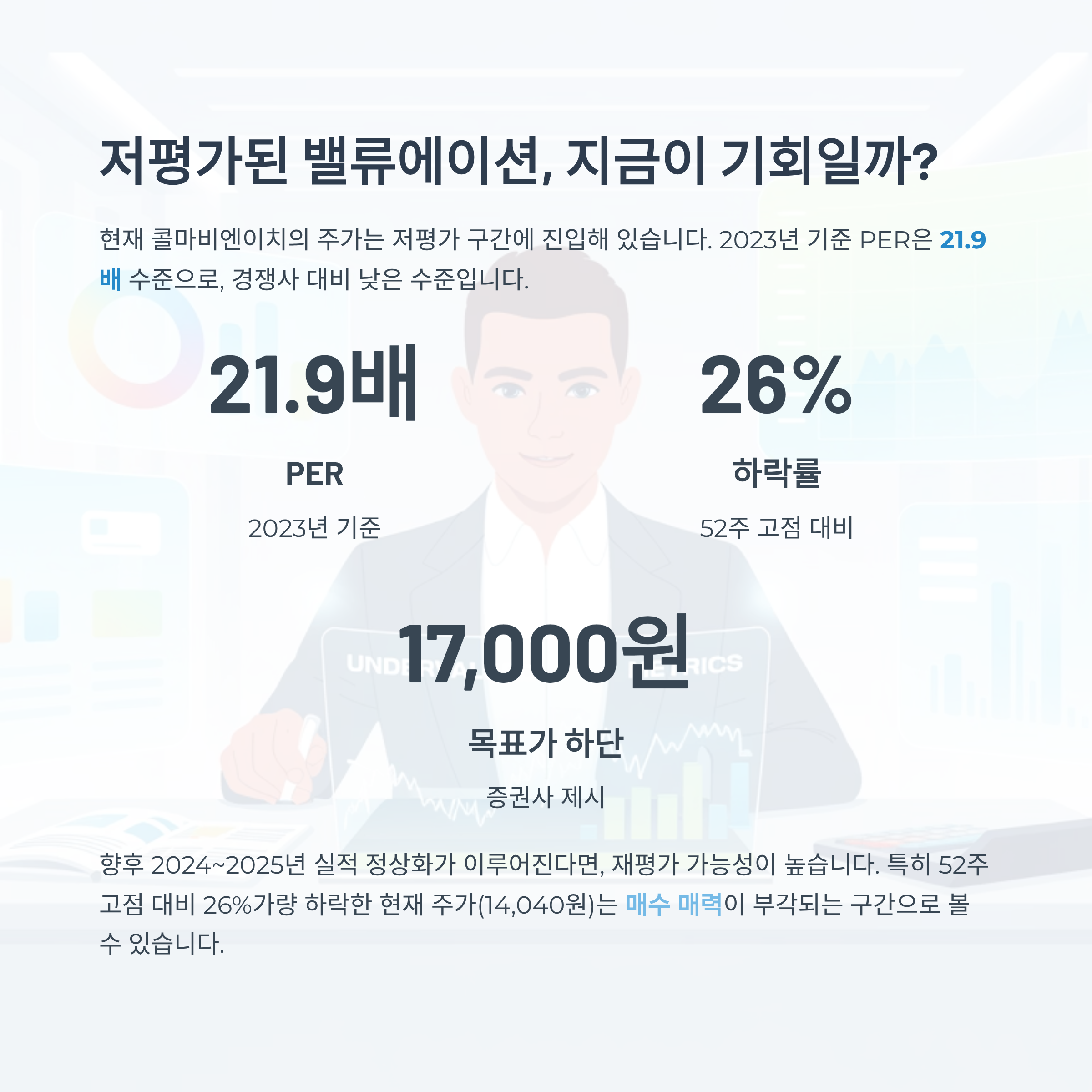 현재 콜마비엔이치의 주가는 저평가 구간에 진입해 있습니다. 2023년 기준 PER은 21.9배 수준으로, 경쟁사 대비 낮은 수준이며 향후 2024~2025년 실적 정상화가 이루어진다면, 재평가 가능성이 높습니다. 특히 52주 고점 대비 26%가량 하락한 현재 주가(14,040원)는 매수 매력이 부각되는 구간으로 볼 수 있습니다.