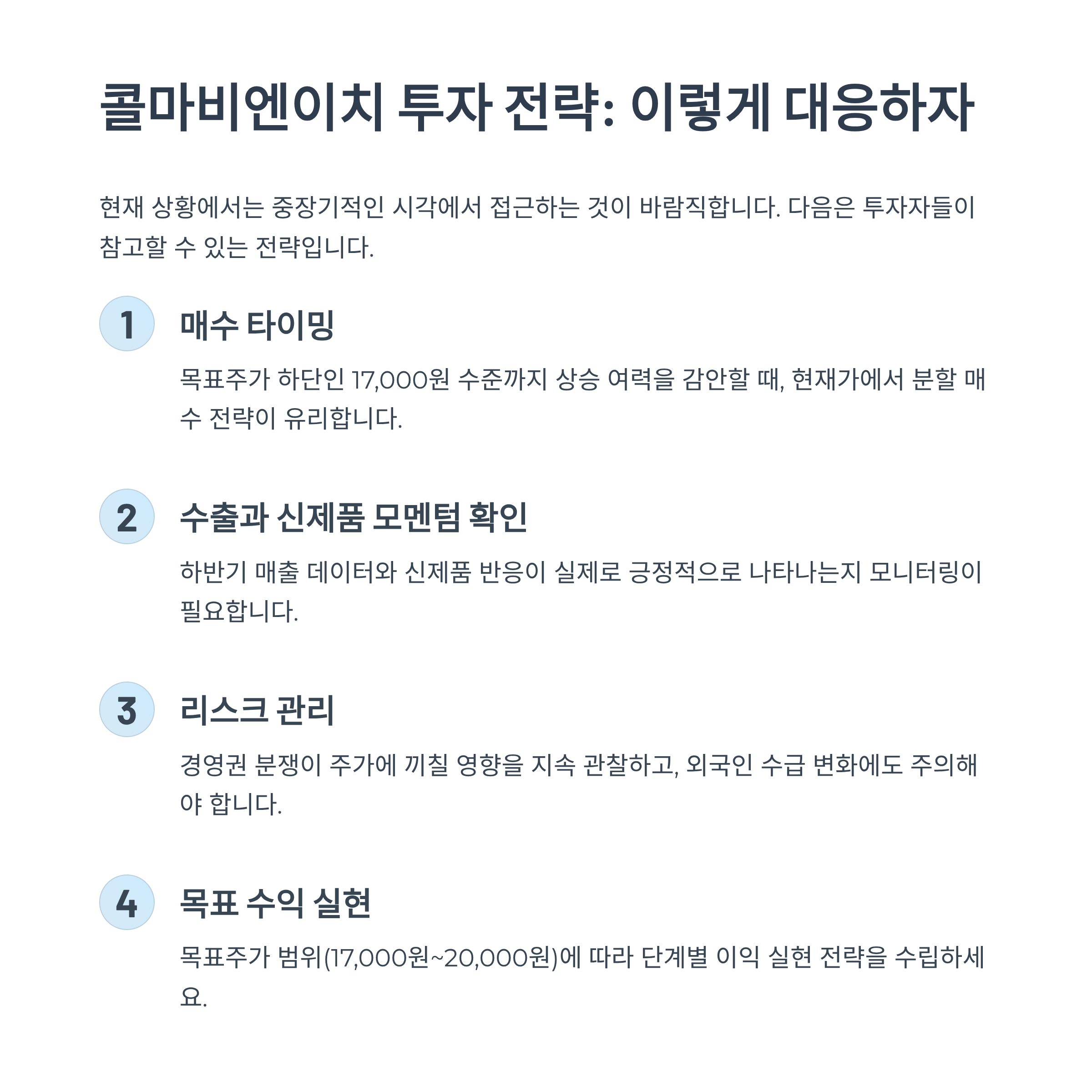- 매수 타이밍: 목표주가 하단인 17,000원 수준까지 상승 여력을 감안할 때, 현재가에서 분할 매수 전략이 유리합니다.