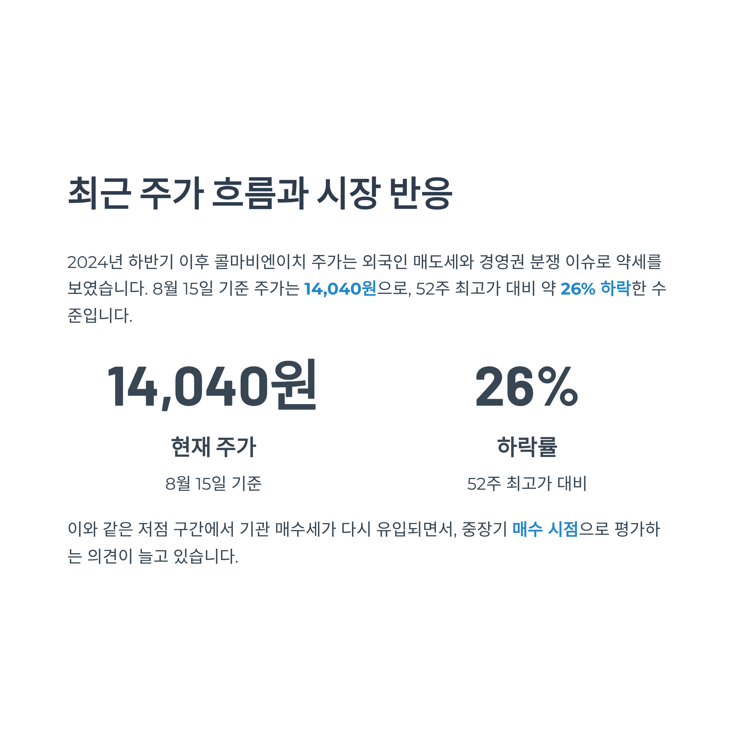 2024년 하반기 이후 콜마비엔이치 주가는 외국인 매도세와 경영권 분쟁 이슈 등으로 약세를 보였습니다. 8월 15일 기준 주가는 14,040원으로, 이는 52주 최고가 대비 약 26% 하락한 수준입니다. 하지만 이와 같은 저점 구간에서 기관 매수세가 다시 유입되면서, 중장기 매수 시점으로 평가하는 의견이 늘고 있습니다.