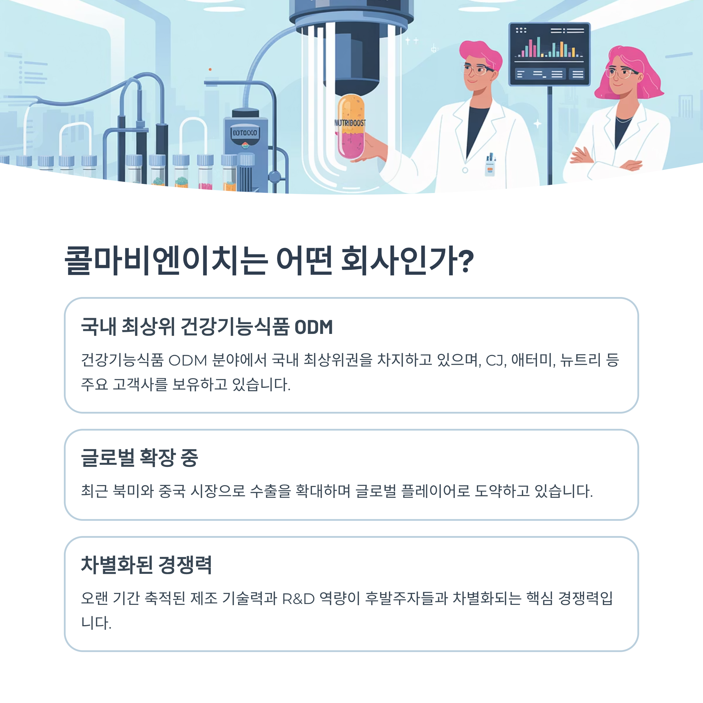 콜마비엔이치는 건강기능식품 ODM 분야에서 국내 최상위권을 차지하고 있는 기업입니다. 주요 고객사는 CJ, 애터미, 뉴트리 등으로 구성되어 있으며, 최근에는 북미와 중국 시장으로 수출 확대를 진행하고 있어 글로벌 플레이어로 도약하고 있습니다. 또한, 콜마비엔이치의 강점은 오랜 기간 축적된 제조 기술력과 R&D 역량이며, 이는 후발주자들과 차별화되는 경쟁력으로 평가받고 있습니다.