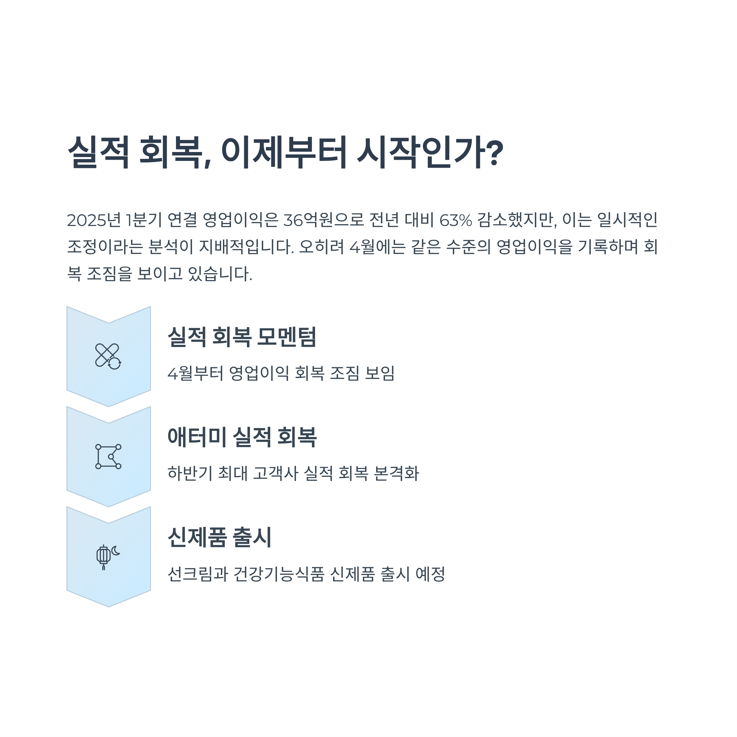 가장 중요한 포인트는 콜마비엔이치의 실적 회복 모멘텀입니다. 2025년 1분기 연결 영업이익은 36억원으로 전년 대비 63% 감소했지만, 이는 일시적인 조정이라는 분석이 지배적입니다. 오히려 4월에는 같은 수준의 영업이익을 기록하며 회복 조짐을 보이고 있습니다. 하반기에는 최대 고객사인 애터미의 실적 회복이 본격화되며, 동시에 선크림과 건강기능식품 신제품이 출시될 예정이어서 매출과 이익 모두 반등이 기대됩니다.