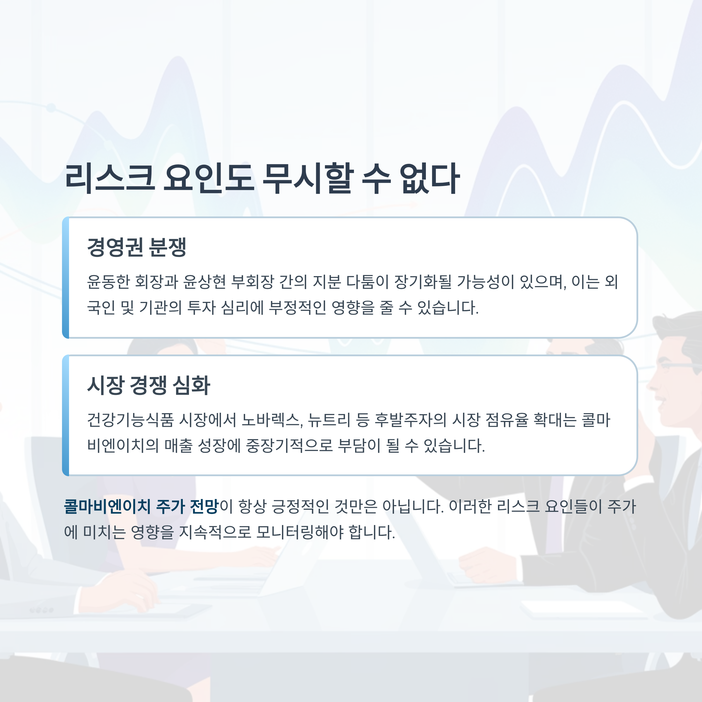 하지만 콜마비엔이치 주가 전망이 항상 긍정적인 것만은 아닙니다. 단기적으로는 경영권 분쟁이라는 민감한 리스크가 존재합니다. 윤동한 회장과 윤상현 부회장 간의 지분 다툼이 장기화될 가능성이 있으며, 이는 외국인 및 기관의 투자 심리에 부정적인 영향을 줄 수 있습니다.