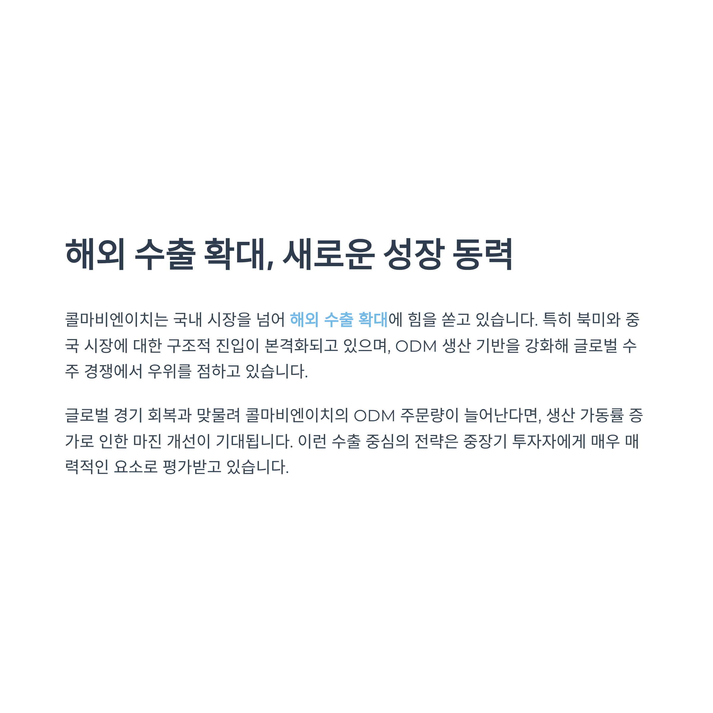 콜마비엔이치는 국내 시장을 넘어 해외 수출 확대에 힘을 쏟고 있습니다. 특히 북미와 중국 시장에 대한 구조적 진입이 본격화되고 있으며, ODM 생산 기반을 강화해 글로벌 수주 경쟁에서 우위를 점하고 있습니다. 이는 단순히 수익성 개선을 넘어서 향후 성장성에도 긍정적인 영향을 줄 수 있는 요인입니다.